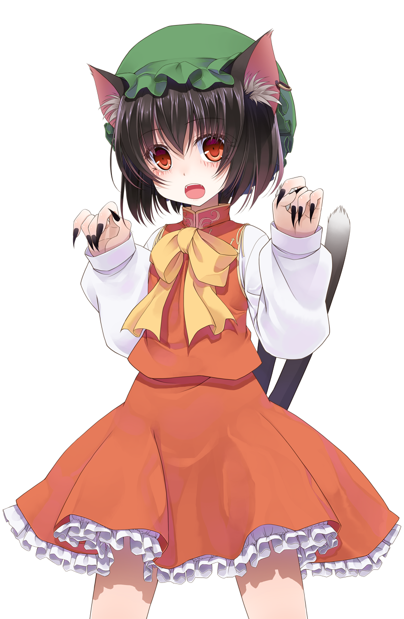 1girl animal_ear_fluff animal_ears black_nails blush bow brown_hair cat_ears cat_girl cat_tail chen commentary_request cowboy_shot crote fingernails frilled_skirt frills green_hat hands_up hat highres large_variant_set legs_apart long_sleeves looking_at_viewer mob_cap multiple_tails nail_polish nekomata open_mouth paw_pose petticoat raised_eyebrows red_eyes red_skirt red_vest sharp_fingernails shirt short_hair skirt sleeve_cuffs sleeves_past_wrists standing tachi-e tail teeth touhou transparent_background two_tails upper_teeth_only variant_set vest white_shirt wide-eyed yellow_bow