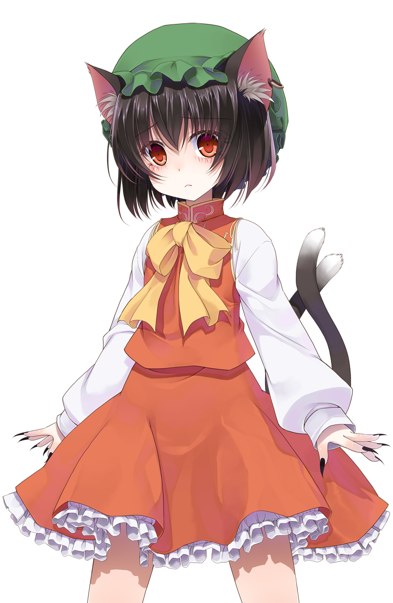 1girl animal_ear_fluff animal_ears black_nails blush bow brown_hair cat_ears cat_girl cat_tail chen closed_mouth commentary_request cowboy_shot crote fingernails frilled_skirt frills furrowed_brow green_hat hat highres large_variant_set legs_apart long_sleeves looking_at_viewer mob_cap multiple_tails nail_polish nekomata petticoat red_eyes red_skirt red_vest sharp_fingernails shirt short_hair skirt sleeve_cuffs sleeves_past_wrists standing tachi-e tail touhou transparent_background two_tails variant_set vest white_shirt wide-eyed yellow_bow