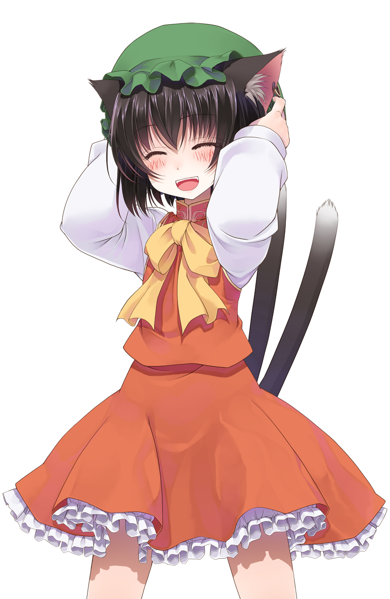 1girl :d ^_^ animal_ear_fluff animal_ears arms_behind_head arms_up blush bow brown_hair cat_ears cat_girl cat_tail chen closed_eyes commentary_request cowboy_shot crote facing_viewer frilled_skirt frills green_hat hat highres large_variant_set legs_apart long_sleeves mob_cap multiple_tails nekomata open_mouth petticoat raised_eyebrows red_skirt red_vest shirt short_hair skirt sleeve_cuffs sleeves_past_wrists smile standing tachi-e tail teeth touhou transparent_background two_tails upper_teeth_only variant_set vest white_shirt yellow_bow