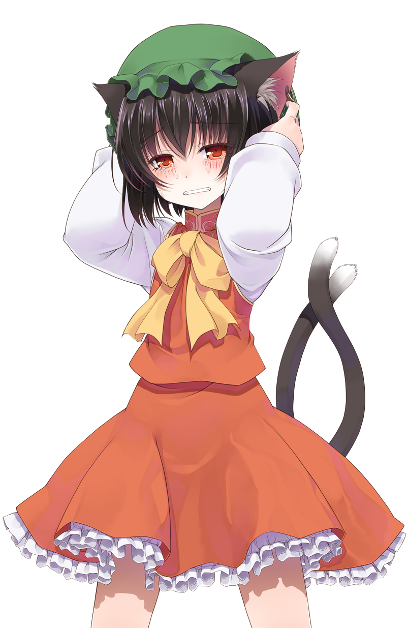 1girl animal_ear_fluff animal_ears arms_behind_head arms_up blush bow brown_hair cat_ears cat_girl cat_tail chen clenched_teeth commentary_request cowboy_shot crote frilled_skirt frills furrowed_brow green_hat half-closed_eyes hat highres large_variant_set legs_apart long_sleeves looking_at_viewer mob_cap multiple_tails nekomata parted_lips petticoat red_eyes red_skirt red_vest shirt short_hair skirt sleeve_cuffs sleeves_past_wrists smile standing tachi-e tail tearing_up teeth touhou transparent_background two_tails variant_set vest white_shirt yellow_bow