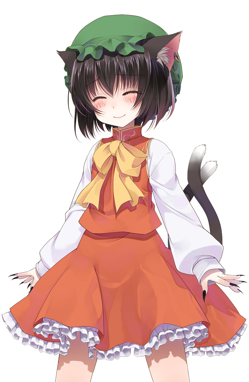 1girl ^_^ animal_ear_fluff animal_ears black_nails blush bow brown_hair cat_ears cat_girl cat_tail chen closed_eyes closed_mouth commentary_request cowboy_shot crote facing_viewer fingernails frilled_skirt frills furrowed_brow green_hat hat highres large_variant_set legs_apart long_sleeves mob_cap multiple_tails nail_polish nekomata petticoat red_skirt red_vest sharp_fingernails shirt short_hair skirt sleeve_cuffs sleeves_past_wrists smile standing tachi-e tail touhou transparent_background two_tails variant_set vest white_shirt yellow_bow