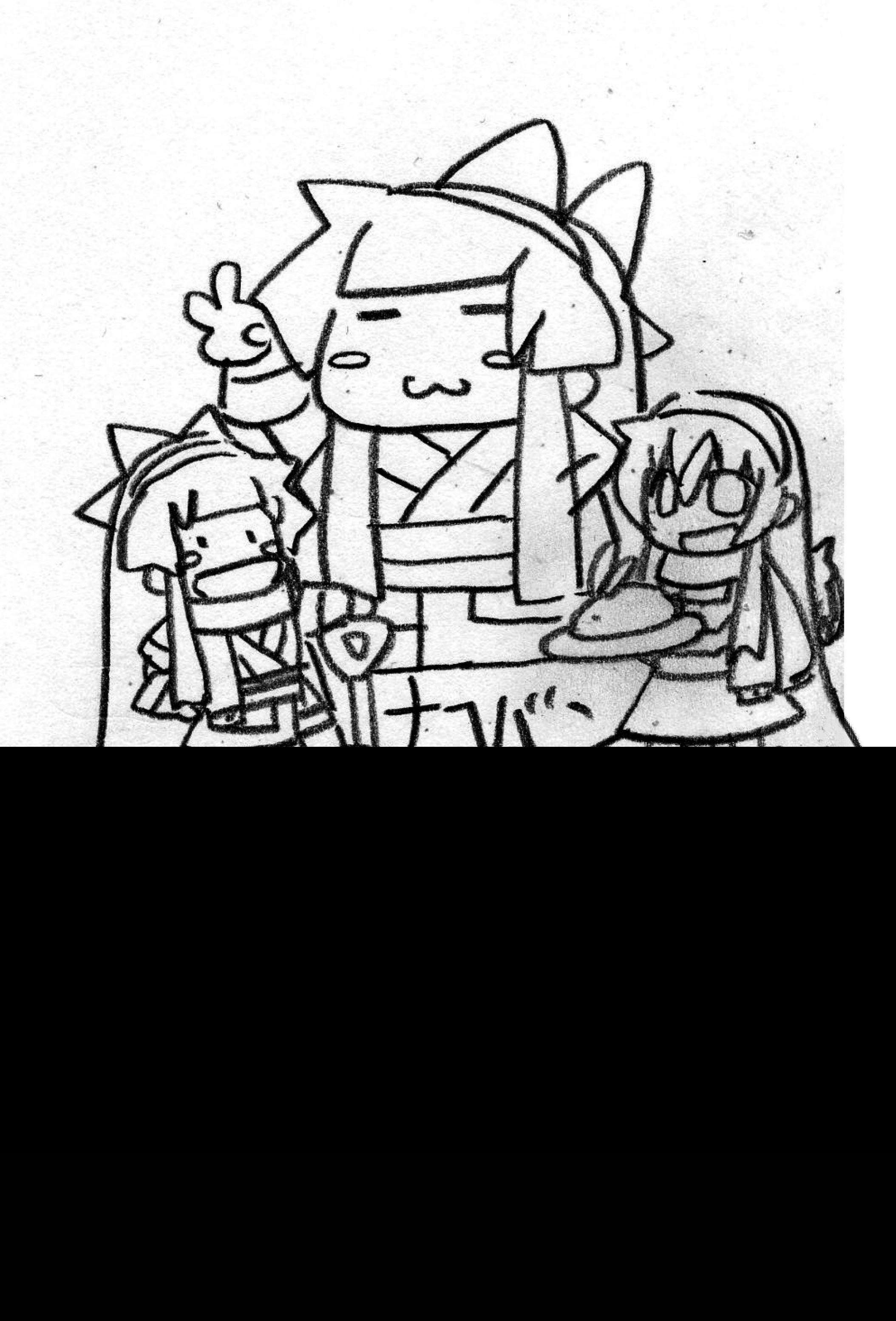2girls ainu_clothes breasts camisole chibi dot_eyes fingerless_gloves food gloves hair_ribbon hairband hand_on_own_hip highres legs long_hair monochrome multiple_girls nakoruru nomeno_mizuha open_mouth original ribbon samurai_spirits scarf sketch small_breasts smile snk statue the_king_of_fighters thighs tongue traditional_media v