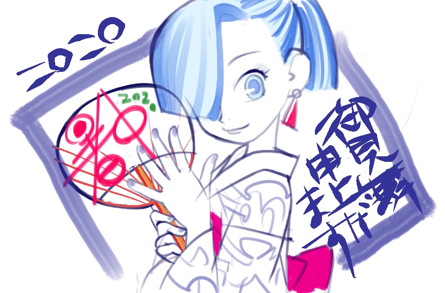 1girl blue_eyes blue_hair closed_mouth earrings grandia grandia_i hair_over_one_eye hontani_toshiaki japanese_clothes jewelry kimono leen_(grandia) lips looking_at_viewer nail_polish official_artist_extra short_hair smile solo