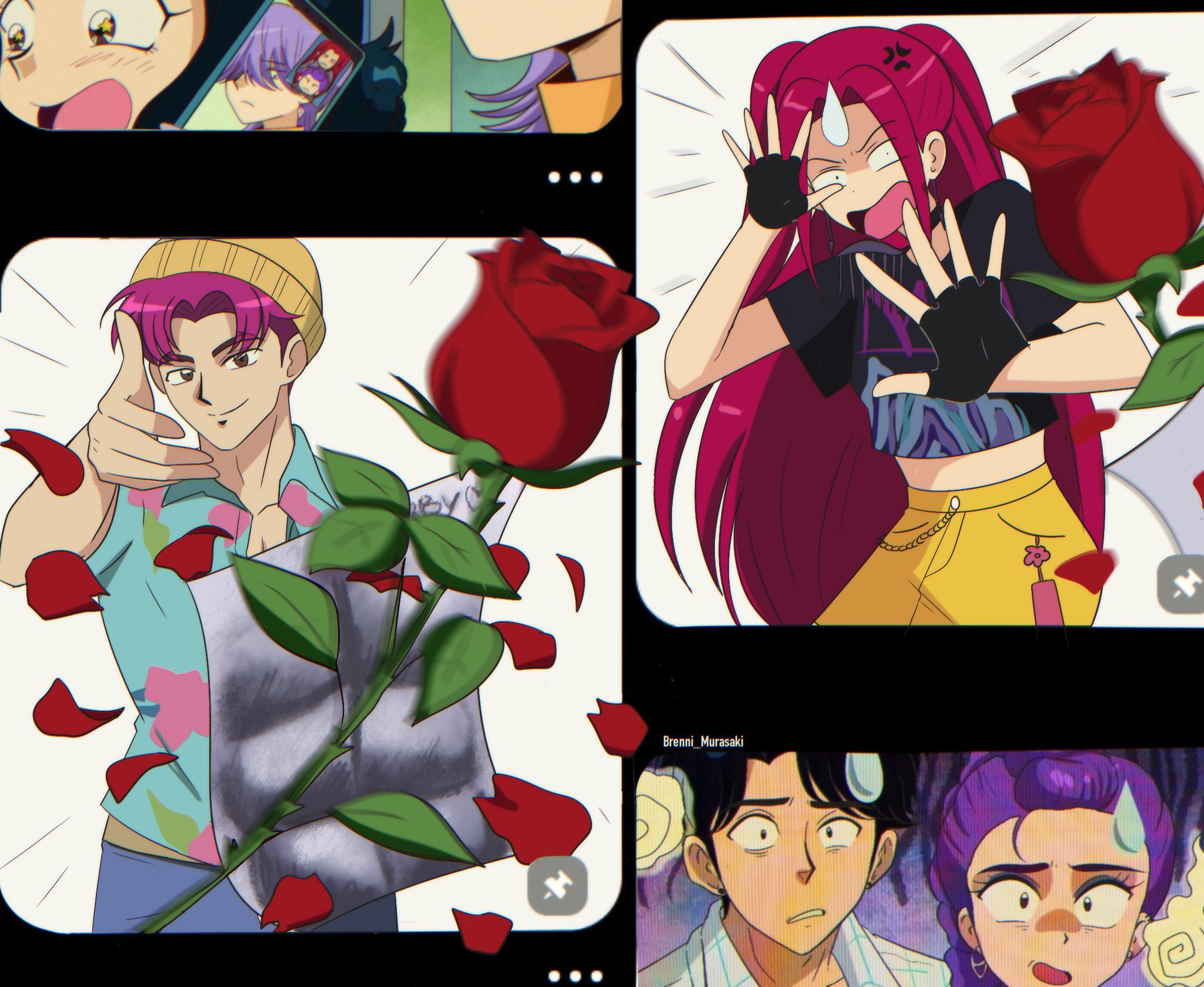 1990s_(style) 3boys 3girls abby_(kpop_demon_hunters) black_hair blunt_bangs braid brenni_murasaki commentary double_bun flower hair_bun highres jewelry jinu_(kpop_demon_hunters) kpop_demon_hunters long_hair meme mira_(kpop_demon_hunters) multiple_boys multiple_girls mystery_(kpop_demon_hunters) pink_hair purple_hair retro_artstyle rose rumi_(kpop_demon_hunters) short_bangs untranslatable_commentary woe_plague_be_upon_ye_(meme) zoey_(kpop_demon_hunters)