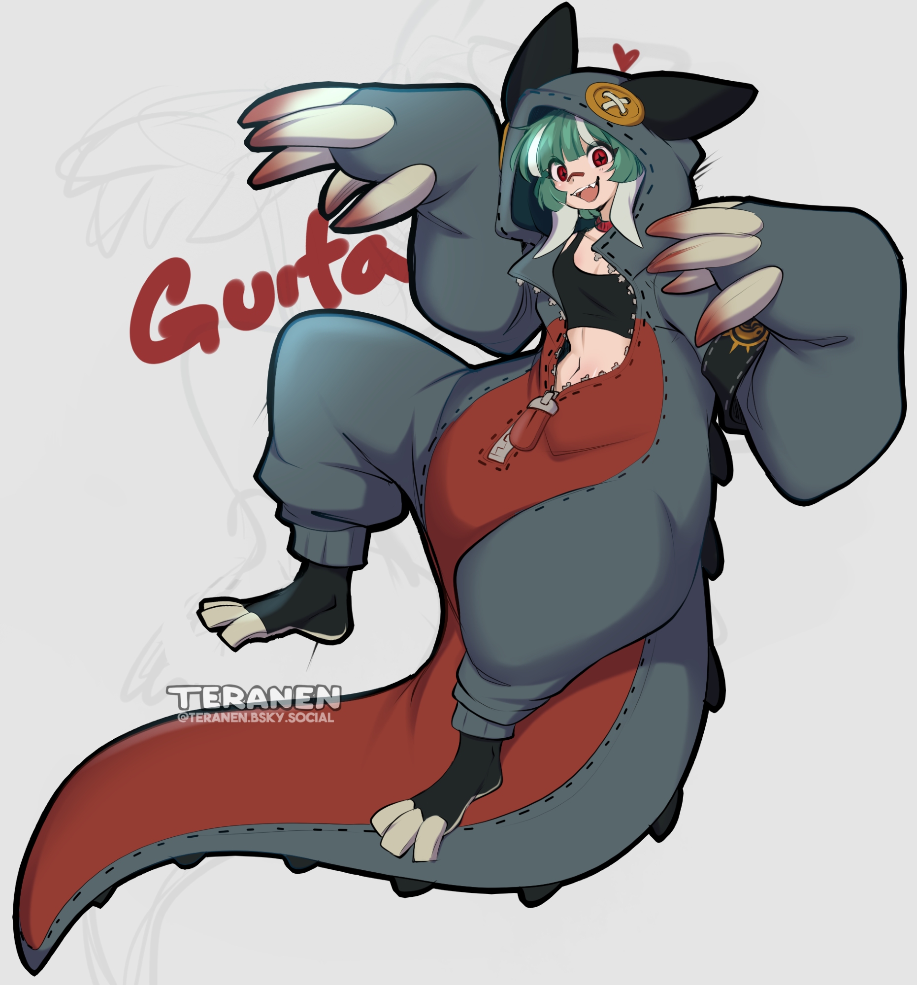 1girl black_shirt choker commentary english_commentary fang gachiakuta green_hair guita_hebby_fantasia highres looking_at_viewer medium_hair multicolored_hair onesie open_mouth red_choker red_eyes shirt smile solo teranen two-tone_hair white_background white_hair