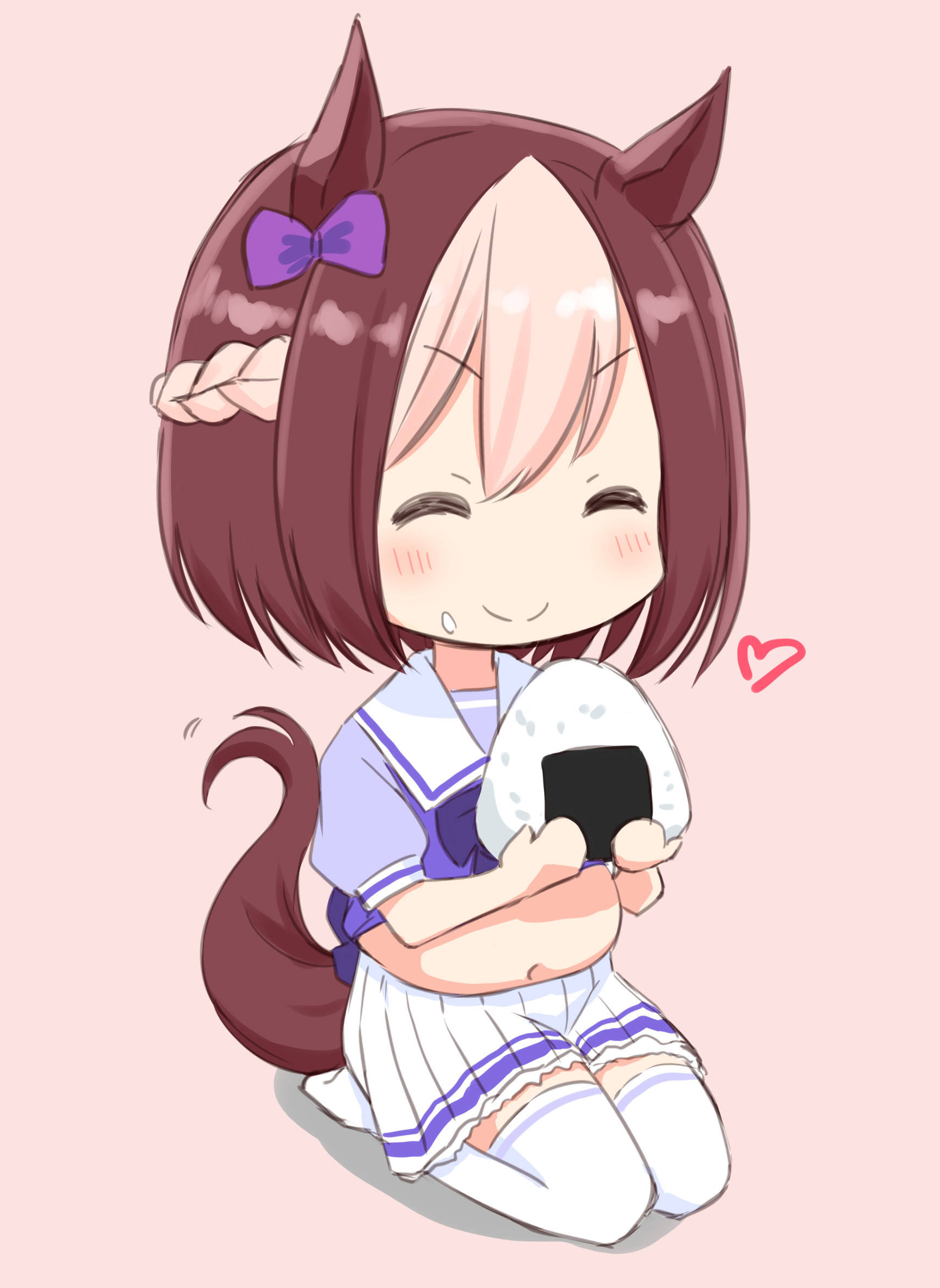 1girl ^_^ animal_ears big_belly blush bow braid brown_hair chibi closed_eyes commentary_request facing_ahead fat fat_woman food food_on_face full_body hair_between_eyes hair_bow half_up_braid heart highres holding holding_food horse_ears horse_girl horse_tail medium_hair miniskirt no_shoes onigiri pink_background purple_bow purple_serafuku retsumaru rice rice_on_face sailor_collar sailor_shirt school_uniform seiza serafuku shirt short_sleeves simple_background sitting skirt smile solo special_week_(umamusume) summer_uniform tail thighhighs tracen_school_uniform umamusume v-shaped_eyebrows white_sailor_collar white_skirt white_thighhighs zettai_ryouiki