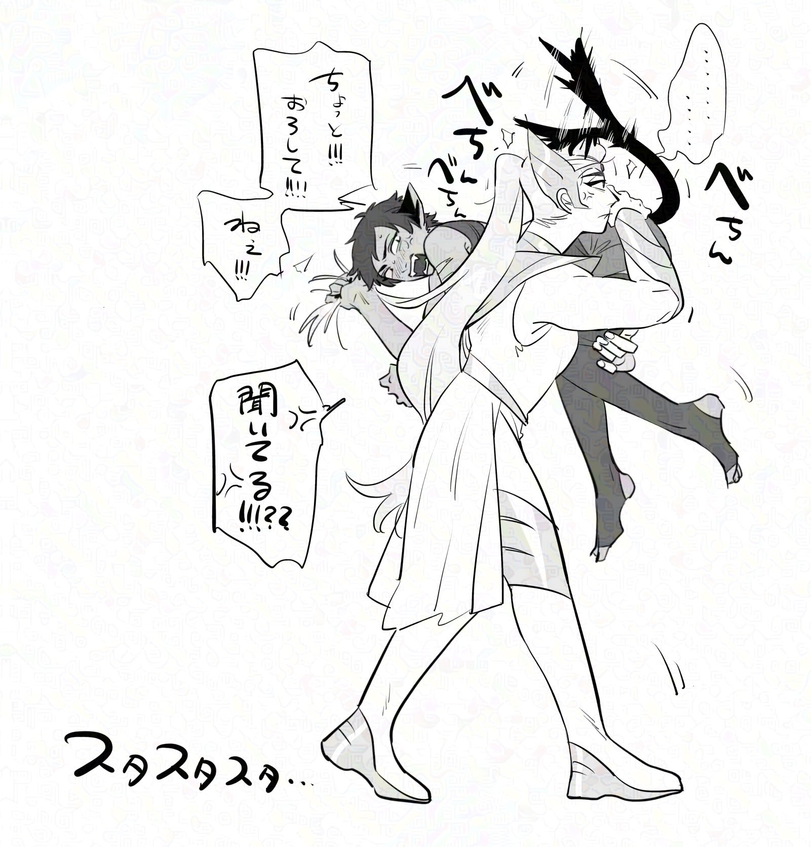 2girls adora_(she-ra) anger_vein animal_ears carrying carrying_over_shoulder carrying_person cat_ears cat_girl catra furry furry_female gaugau7696 greyscale highres long_hair monochrome multiple_girls ponytail she-ra she-ra_and_the_princesses_of_power short_hair shouting stirrup_legwear toeless_legwear translation_request very_long_hair very_short_hair waist_cape