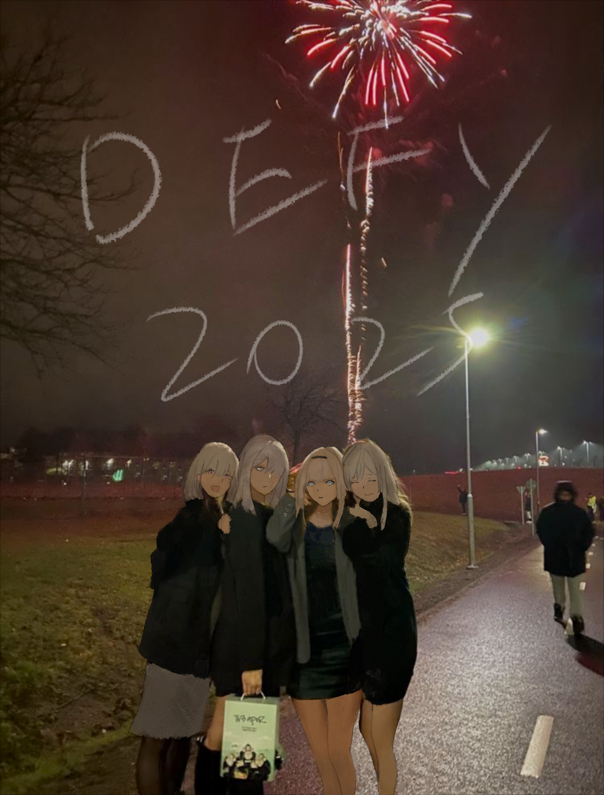 4girls absurdres ak-12_(girls'_frontline) ak-15_(girls'_frontline) an-94_(girls'_frontline) diao_guo_yu fireworks girls'_frontline highres looking_at_viewer multiple_girls new_year purple_eyes rpk-16_(girls'_frontline) shirt short_hair smile white_hair