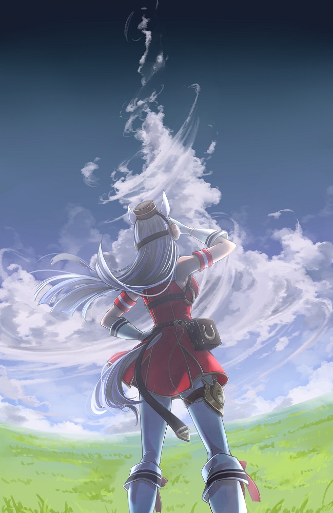 1girl animal_ears armband batako_(pfbatakopd) blunt_bangs boots bow breasts brown_hat cloud commentary_request dress from_behind gloves gold_ship_(red_strife)_(umamusume) gold_ship_(umamusume) grey_hair hat horse_ears horse_girl horse_tail large_breasts long_hair outdoors pantyhose pillbox_hat red_bow red_dress sky sleeveless sleeveless_dress solo striped_armband striped_clothes tail thigh_strap umamusume white_boots white_gloves white_pantyhose