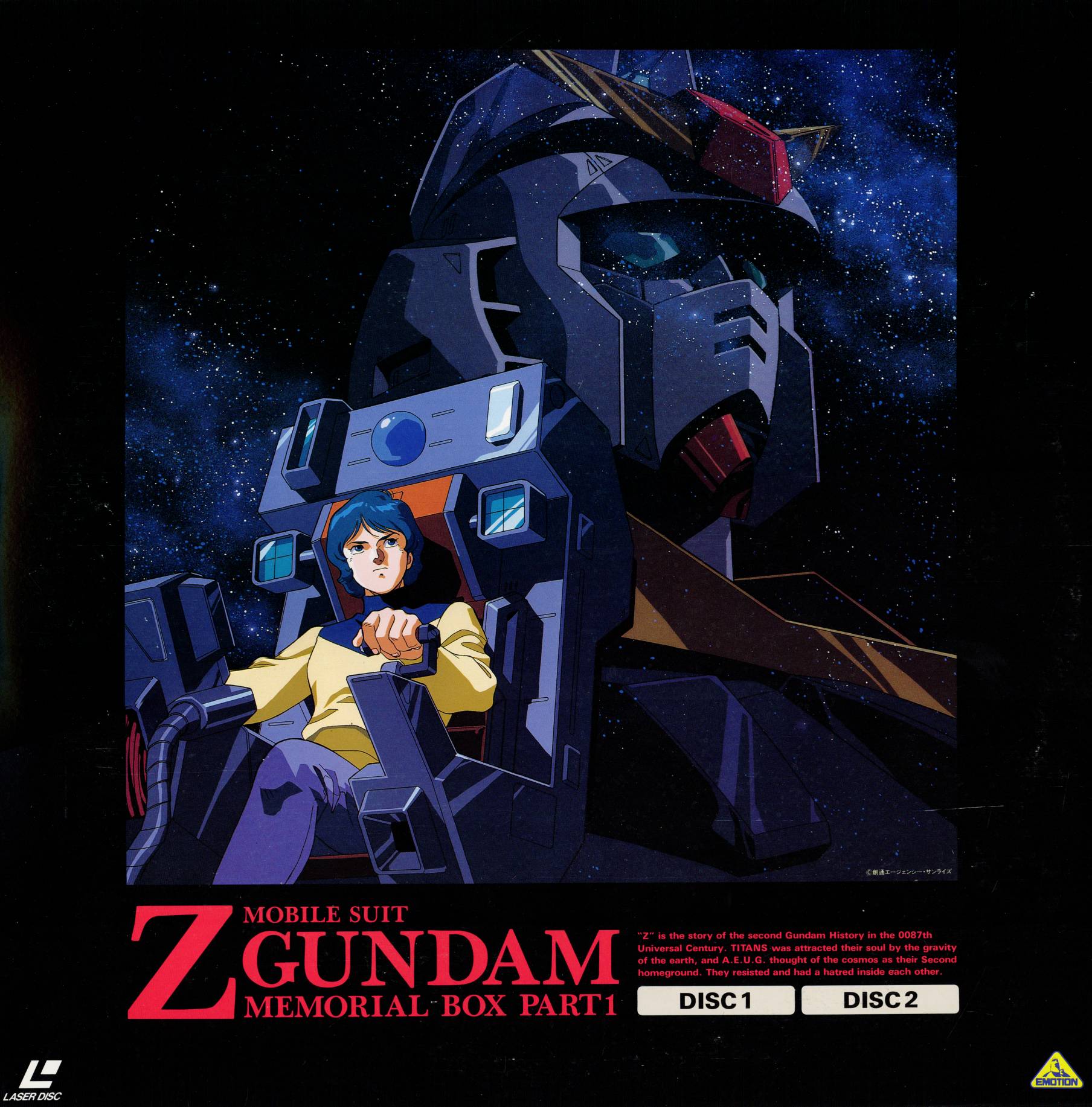 1990s_(style) 1boy aeug blue_eyes blue_hair box_art cable cockpit gundam gundam_mk_ii highres kamille_bidan kitazume_hiroyuki laserdisc_cover logo mecha mobile_suit nebula pilot pilot_chair retro_artstyle robot scan science_fiction space star_(sky) traditional_media turtleneck v-fin zeta_gundam