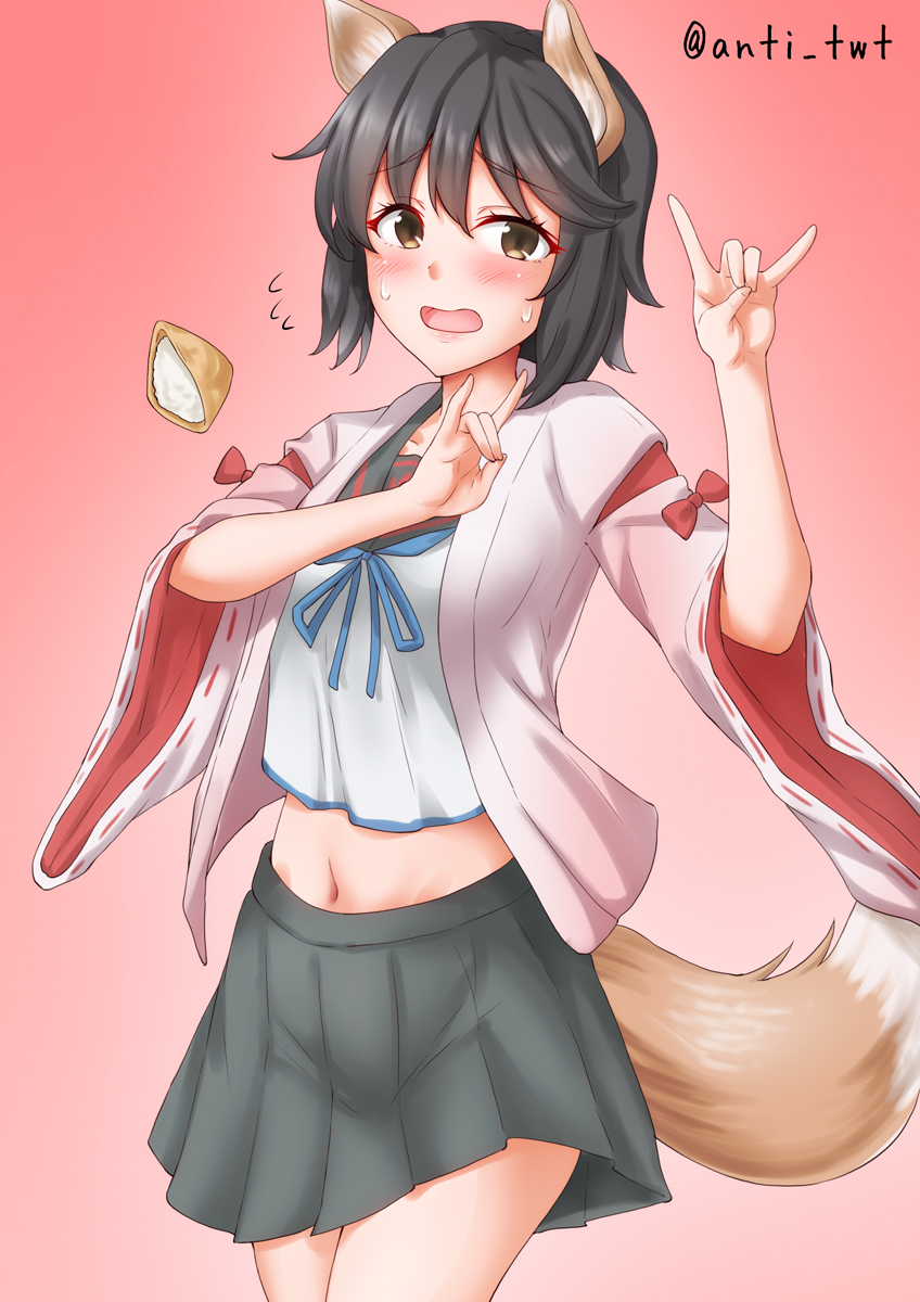 1girl animal_ears anti_(untea9) black_hair black_sailor_collar brown_eyes commentary_request fox_tail highres kantai_collection miyuki_(kancolle) miyuki_(yokosuka)_(kancolle) neckerchief pleated_skirt sailor_collar school_uniform serafuku short_hair short_sleeves skirt smile tail