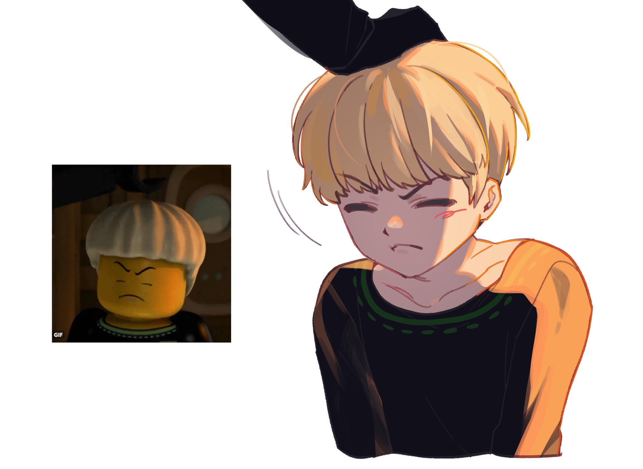 1boy 1other :< animification bad_id bad_twitter_id black_shirt blonde_hair blush bowl_cut closed_eyes closed_mouth commentary_request cropped_torso hand_on_another's_head headpat highres korean_commentary lloyd_garmadon_(young) long_sleeves lord_garmadon male_focus nanunbab0da ninjago pout reference_inset screenshot_inset shirt short_hair simple_background solo upper_body white_background