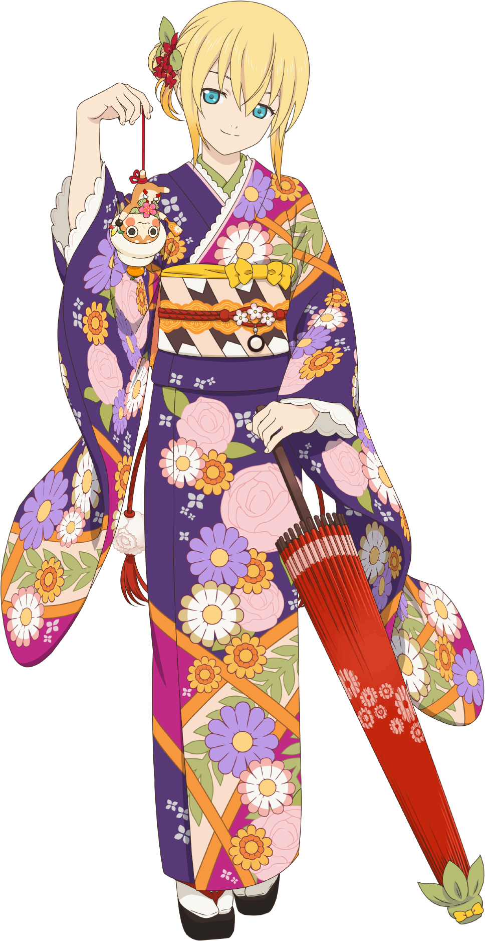 1girl artist_request black_sandals blonde_hair blue_eyes closed_mouth closed_umbrella edna_(kimono)_(tales) edna_(tales) floral_print floral_print_kimono full_body game_cg hair_ornament highres holding holding_umbrella japanese_clothes kimono looking_at_viewer medium_hair normin_(tales) official_alternate_costume official_art phoenix_(tales) print_kimono purple_kimono red_umbrella sandals smile smug solo tales_of_(series) tales_of_asteria tales_of_zestiria third-party_source transparent_background umbrella