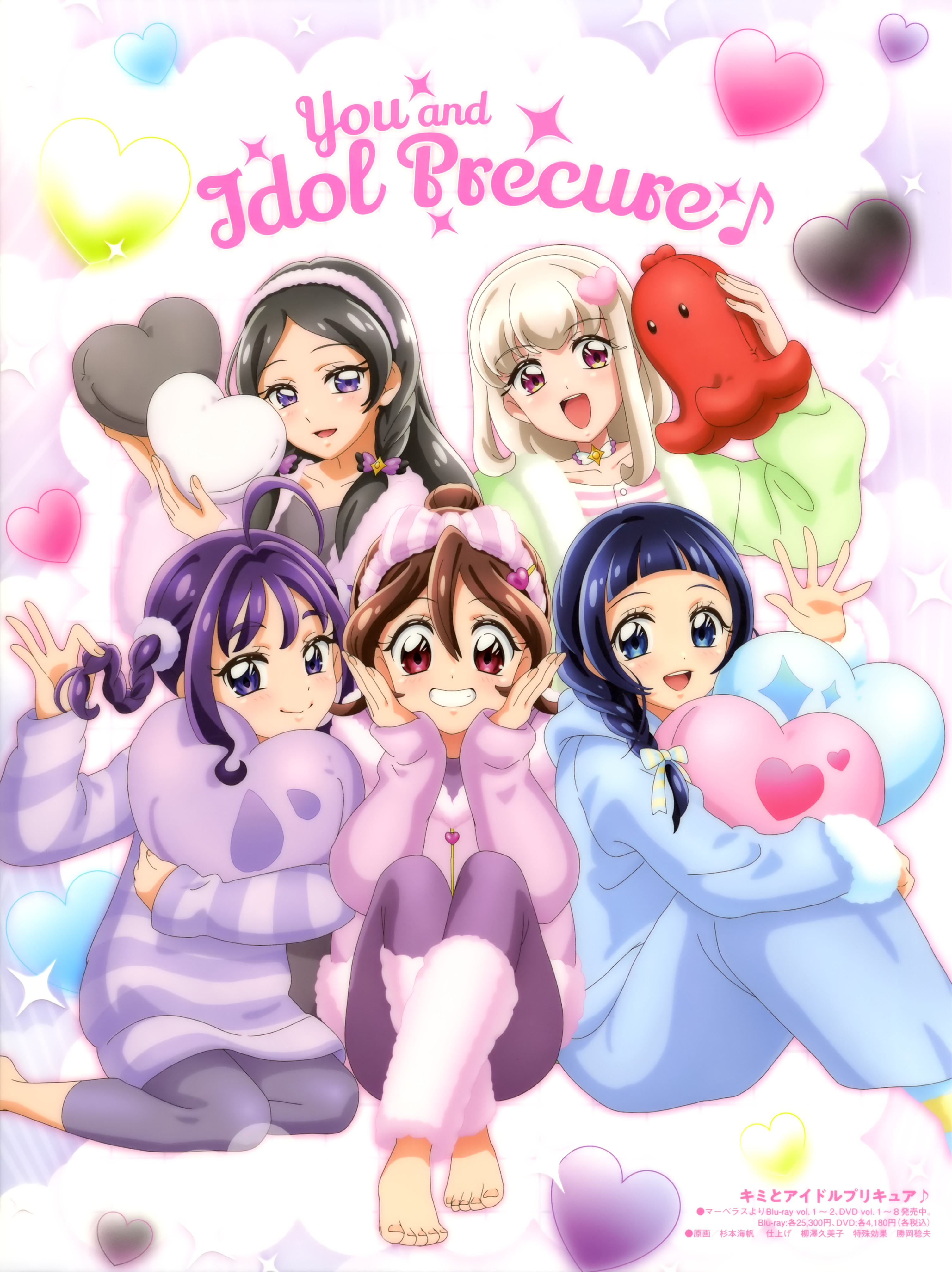 5girls :d absurdres ahoge anime_coloring animedia aokaze_nana arched_bangs barefoot black_hair blonde_hair blue_bow blue_eyes blue_hair blue_pajamas bob_cut bow braid brown_hair closed_mouth collarbone copyright_name copyright_notice crossed_ankles double-parted_bangs feet_out_of_frame fluffy_clothes food food_art green_pajamas grin hair_between_eyes hair_bow hair_ornament hair_scrunchie hairband hairpin hand_up hands_on_own_cheeks hands_on_own_face hands_up heart heart-shaped_pillow heart_hair_ornament highres holding holding_own_hair holding_pillow kimi_to_idol_precure knees_up light_blush long_hair looking_at_viewer low-braided_long_hair low-tied_long_hair magazine_scan medium_hair multiple_girls official_art open_mouth pajamas parted_bangs pillow pink_eyes pink_hairband pink_pajamas precure purple_eyes purple_hair purple_pajamas red_eyes sakura_uta_(precure) scan scrunchie shigure_kokoro sidelocks sitting smile sugimoto_miho tako-san_wiener tanaka_meron tanaka_purin teeth third-party_source twintails upper_teeth_only waving yokozuwari