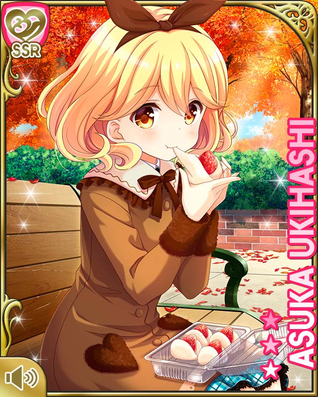 1girl autumn_leaves bench blonde_hair blue_skirt bow bowtie brown_bow brown_bowtie brown_eyes card_(medium) character_name daifuku eating food from_side fur-trimmed_jacket fur_trim girlfriend_(kari) hair_bow holding holding_food ichigo_daifuku jacket leaf looking_at_viewer official_art plaid_clothes plaid_skirt pleated_skirt qp:flapper shirt sitting skirt solo ukihashi_asuka wagashi wooden_bench