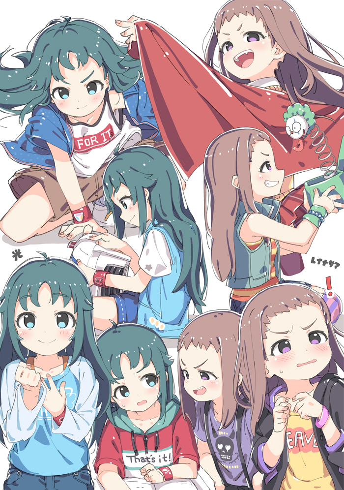 ! 2girls :d ahoge blue_jacket blue_shirt blue_shorts blue_vest blush brown_hair brown_shorts cape closed_mouth commentary_request dot_nose green_hair grin hands_up idolmaster idolmaster_cinderella_girls jack-in-the-box jacket koseki_reina kuresuku_(lessons) long_hair multiple_girls multiple_views nanjo_hikaru open_clothes open_jacket open_mouth pink_eyes red_cape shirt shoes short-sleeved_jacket short_sleeves shorts simple_background sleeveless sleeveless_shirt smile sweatdrop thick_eyebrows v-shaped_eyebrows vest white_background white_shirt white_shoes wristband