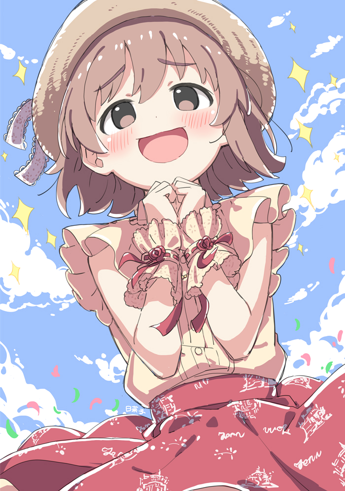 1girl :d blue_sky blush brown_eyes brown_hair brown_hat cloud commentary_request cowboy_shot day dot_nose hands_up hat idolmaster idolmaster_cinderella_girls kita_hinako kuresuku_(lessons) open_mouth outdoors red_skirt shirt short_hair skirt sky sleeveless sleeveless_shirt smile solo sparkle yellow_shirt