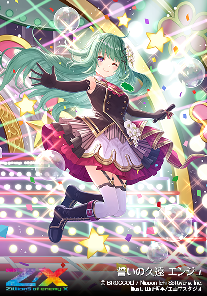 1girl ahoge black_boots black_shirt boots bubble closed_mouth concert confetti copyright_logo copyright_name copyright_notice detached_sleeves enju_(z/x) floating_hair gold_trim green_hair hair_ornament holding holding_microphone idol_clothes jumping logo long_hair microphone official_art one_eye_closed purple_eyes shirt skirt smile star_(symbol) tadokoro_teppei thighhighs translation_request white_thighhighs z/x