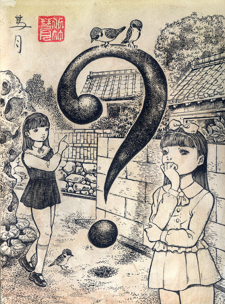 2girls ? animal bamboo_fence bird blush bow bowtie brick_wall dress fence fractal_underground_studio hair_bow hand_to_own_mouth house long_hair long_sleeves mary_janes monochrome multiple_girls neck_ribbon original plant pointing ribbon shirt shoes skirt sky sleeveless sleeveless_dress socks sparrow standing thinking traditional_media