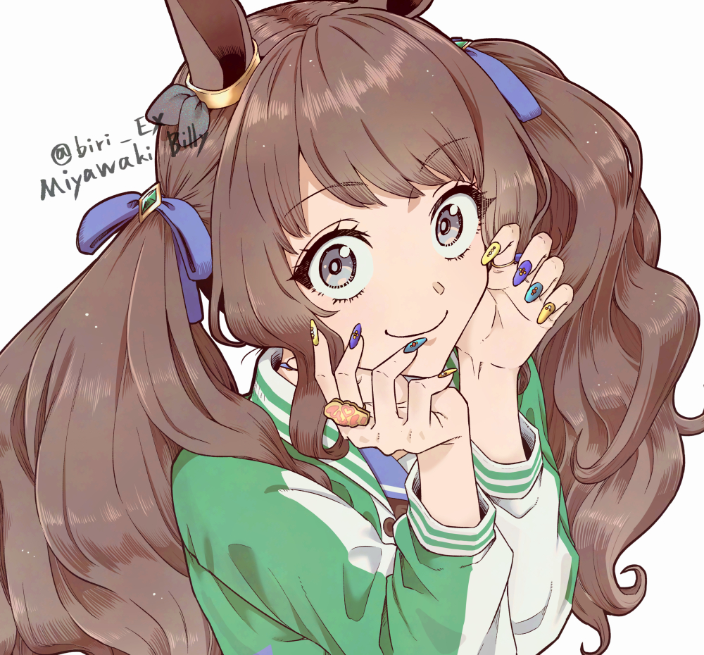 1girl animal_ears birii brown_hair closed_mouth green_jacket grey_eyes hands_on_own_face horse_ears horse_girl jacket long_hair long_sleeves multicolored_nails smile solo tosen_jordan_(umamusume) twintails umamusume upper_body