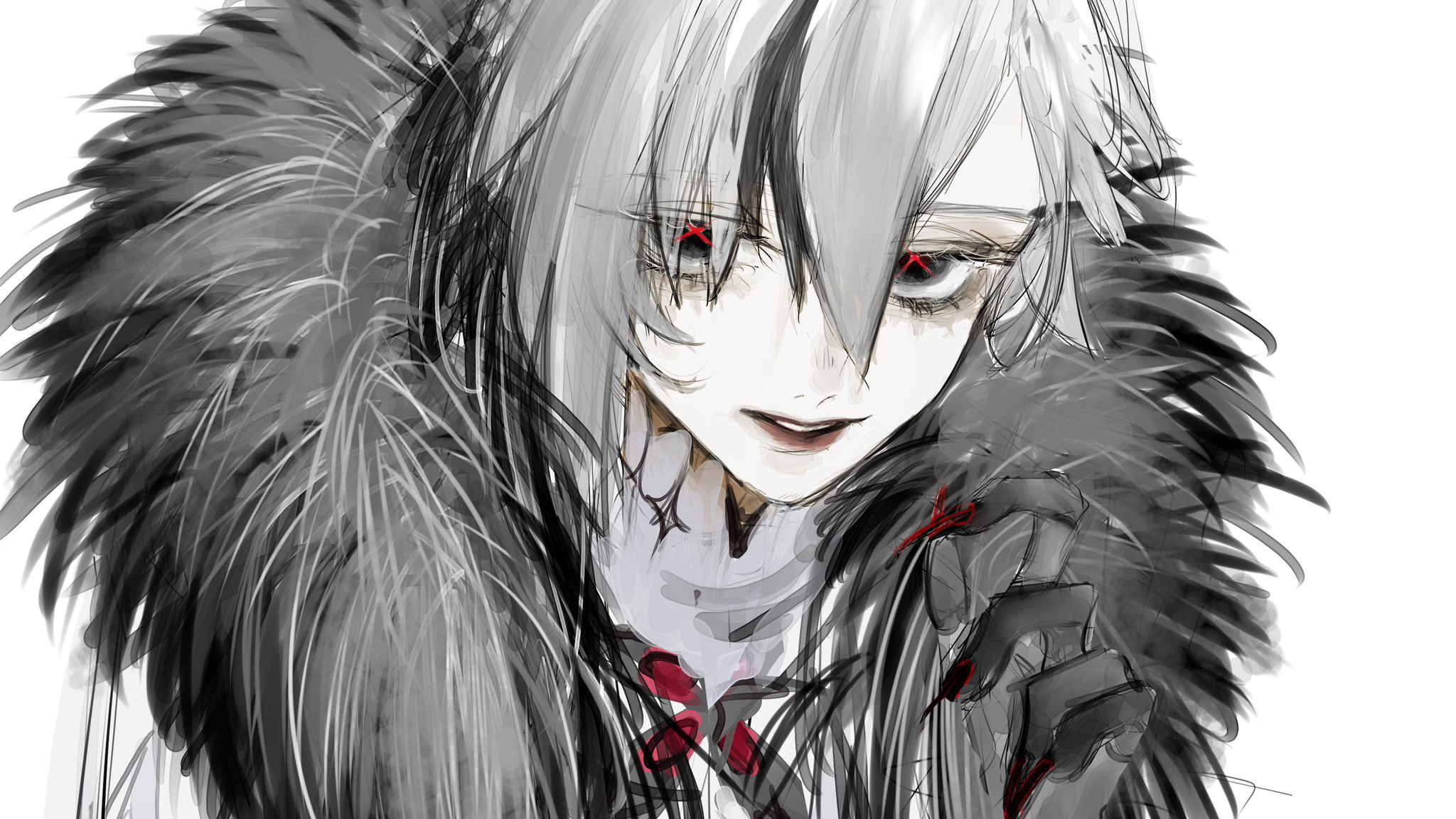 1girl arlecchino_(genshin_impact) black_eyes black_fur black_hair black_streaks coat commentary fur-trimmed_coat fur_trim genshin_impact gloves grey_hair hair_between_eyes highres kota_soydog looking_at_viewer multicolored_hair parted_lips portrait red_pupils simple_background solo streaked_hair symbol-shaped_pupils white_background white_hair x-shaped_pupils