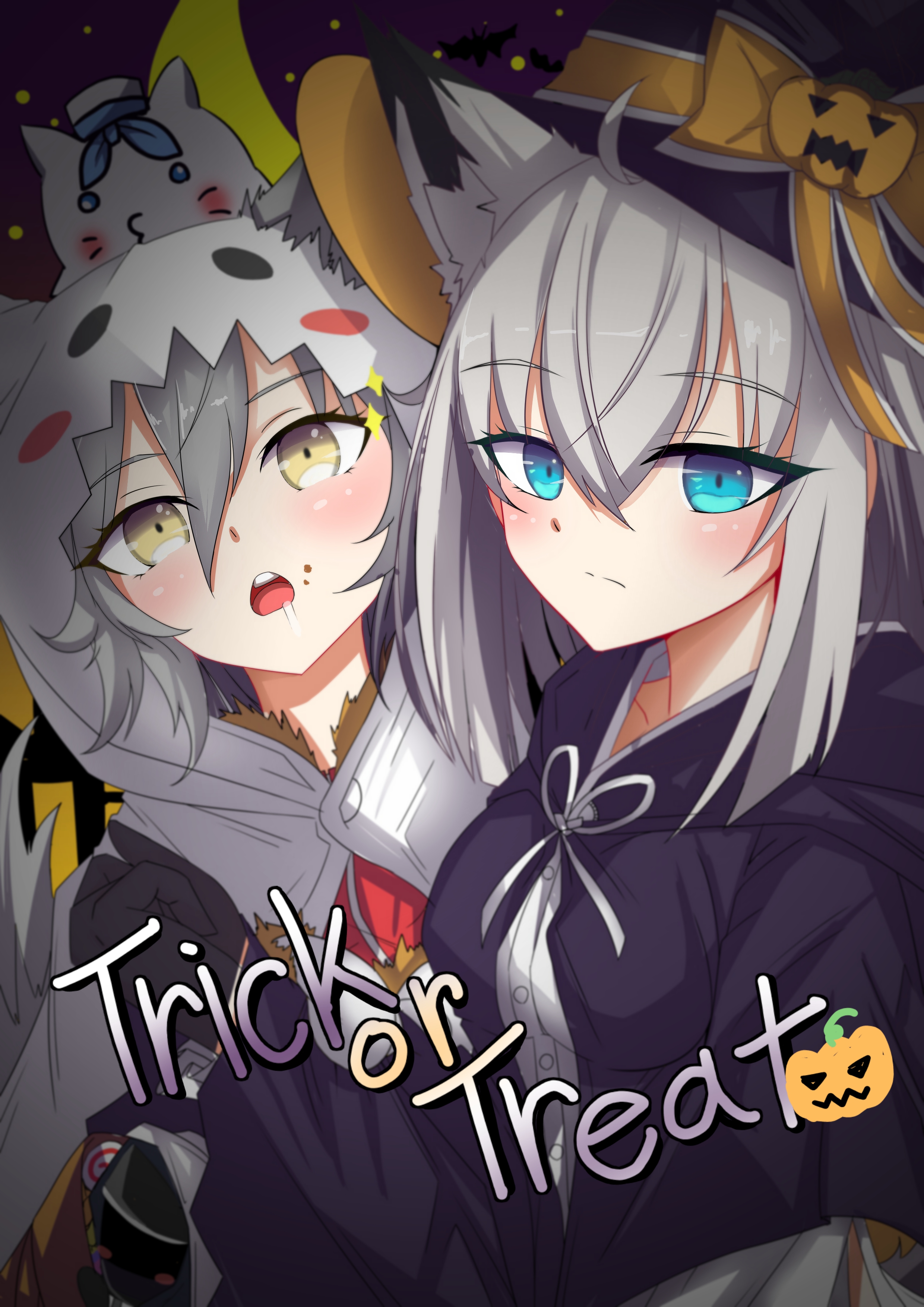 2girls absurdres animal_ears arknights azur_lane black_coat black_gloves blue_eyes bow closed_mouth coat commentary_request crossed_bangs english_text extra_ears fox_ears fox_girl fox_tail fur_collar gloves grey_hair hair_between_eyes halloween hat highres hood kawakaze_(azur_lane) long_sleeves looking_at_viewer multiple_girls open_mouth projekt_red_(arknights) shirt siota1998 tail white_hair white_shirt witch_hat yellow_eyes