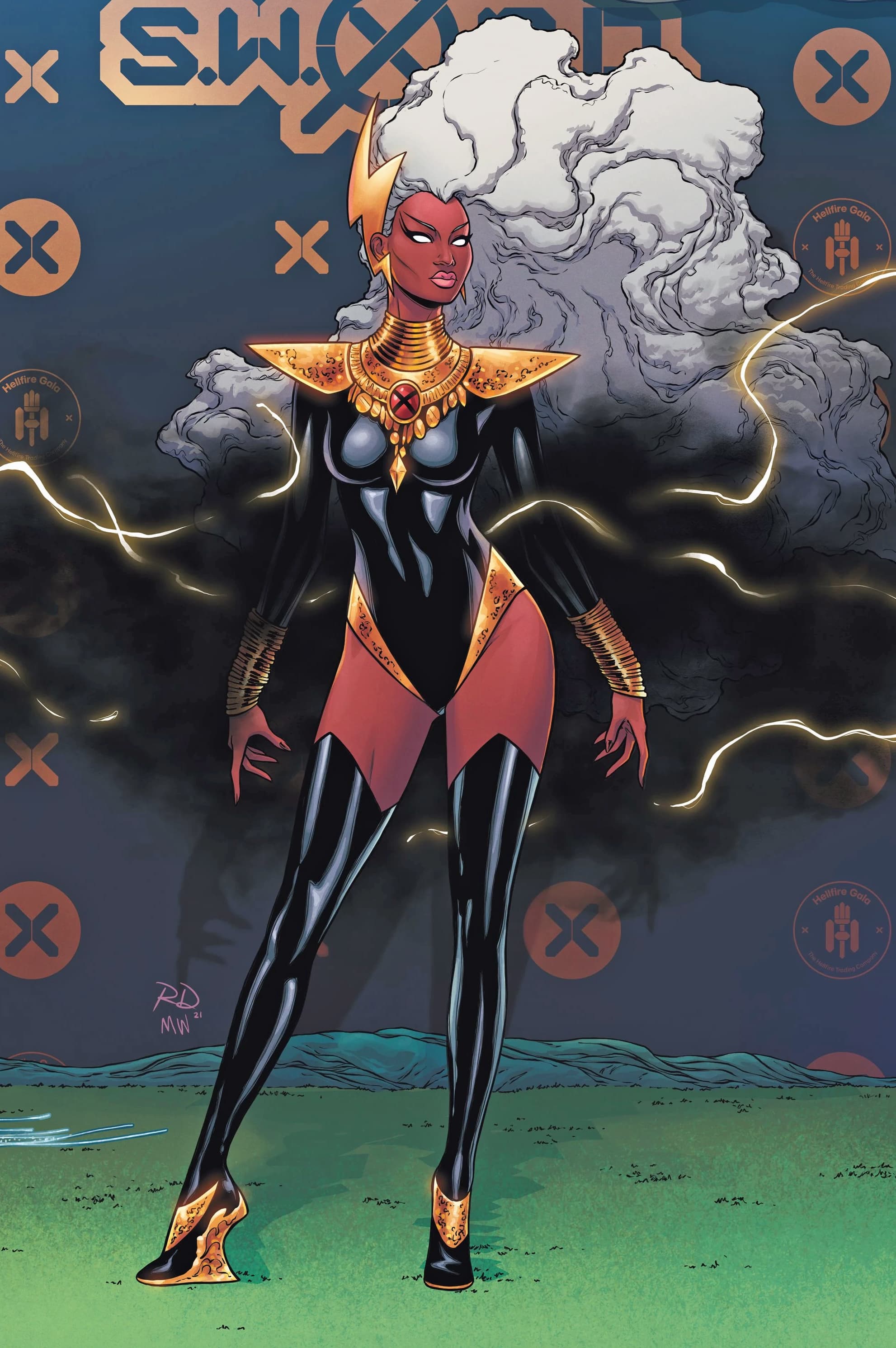 1girl absurdres armor artist_collaboration big_hair black_boots black_leotard boots bracelet breasts cheekbones comic_cover copyright_logo copyright_name curly_hair dark-skinned_female dark_skin earrings floating_hair full_body gold_armor gold_trim hellfire_gala highres jewelry leotard lightning lightning_bolt_earrings lightning_bolt_symbol logo long_hair looking_to_the_side marvel matt_wilson medium_breasts no_pupils official_alternate_costume official_art pauldrons russell_dauterman shoulder_armor storm_(x-men) thigh_boots very_long_hair western_comics_(style) white_hair x-men