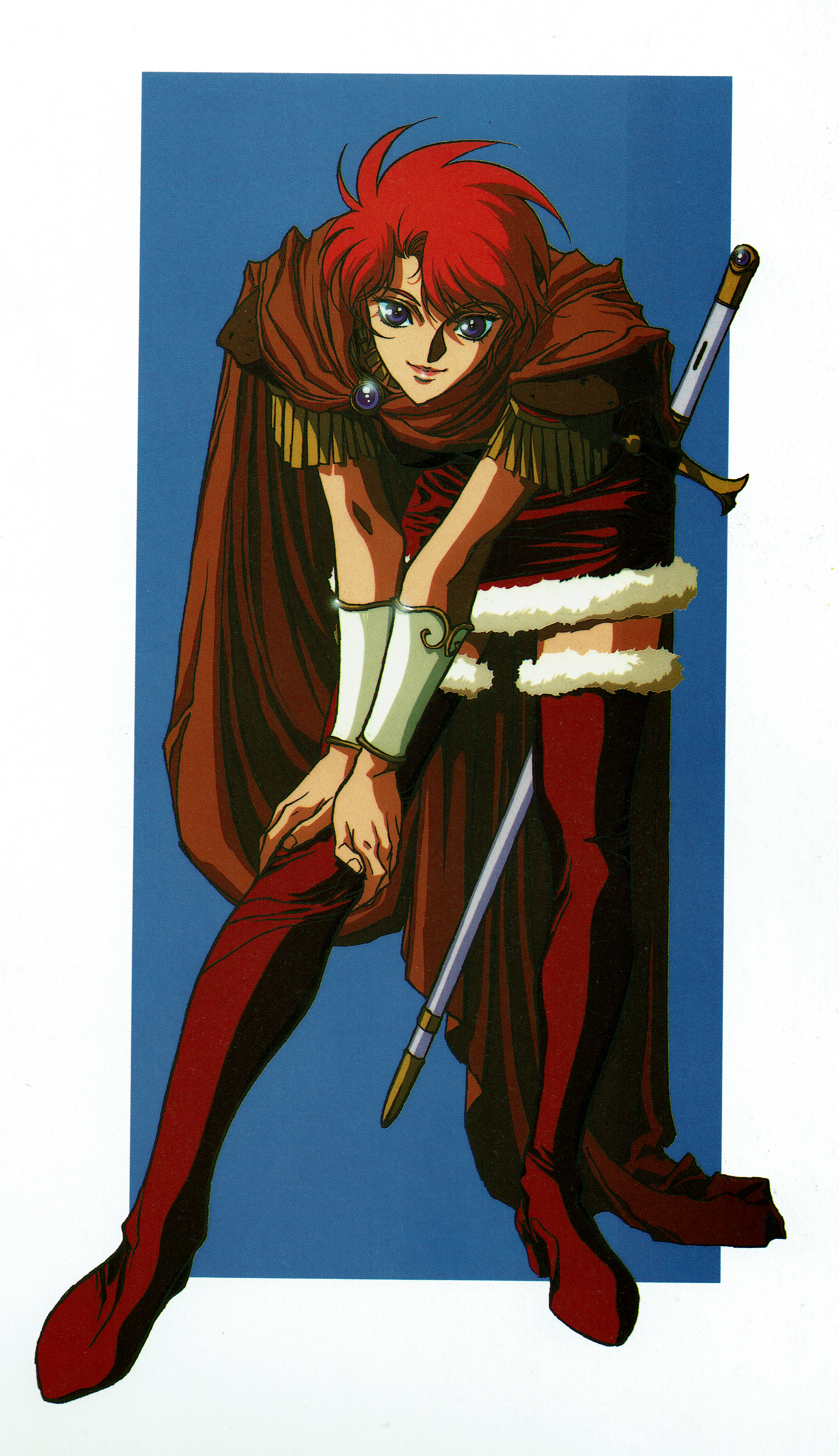 1990s_(style) absurdres blue_eyes boots cape highres non-web_source record_of_lodoss_war red_hair retro_artstyle shiris_(lodoss) sword weapon yuuki_nobuteru