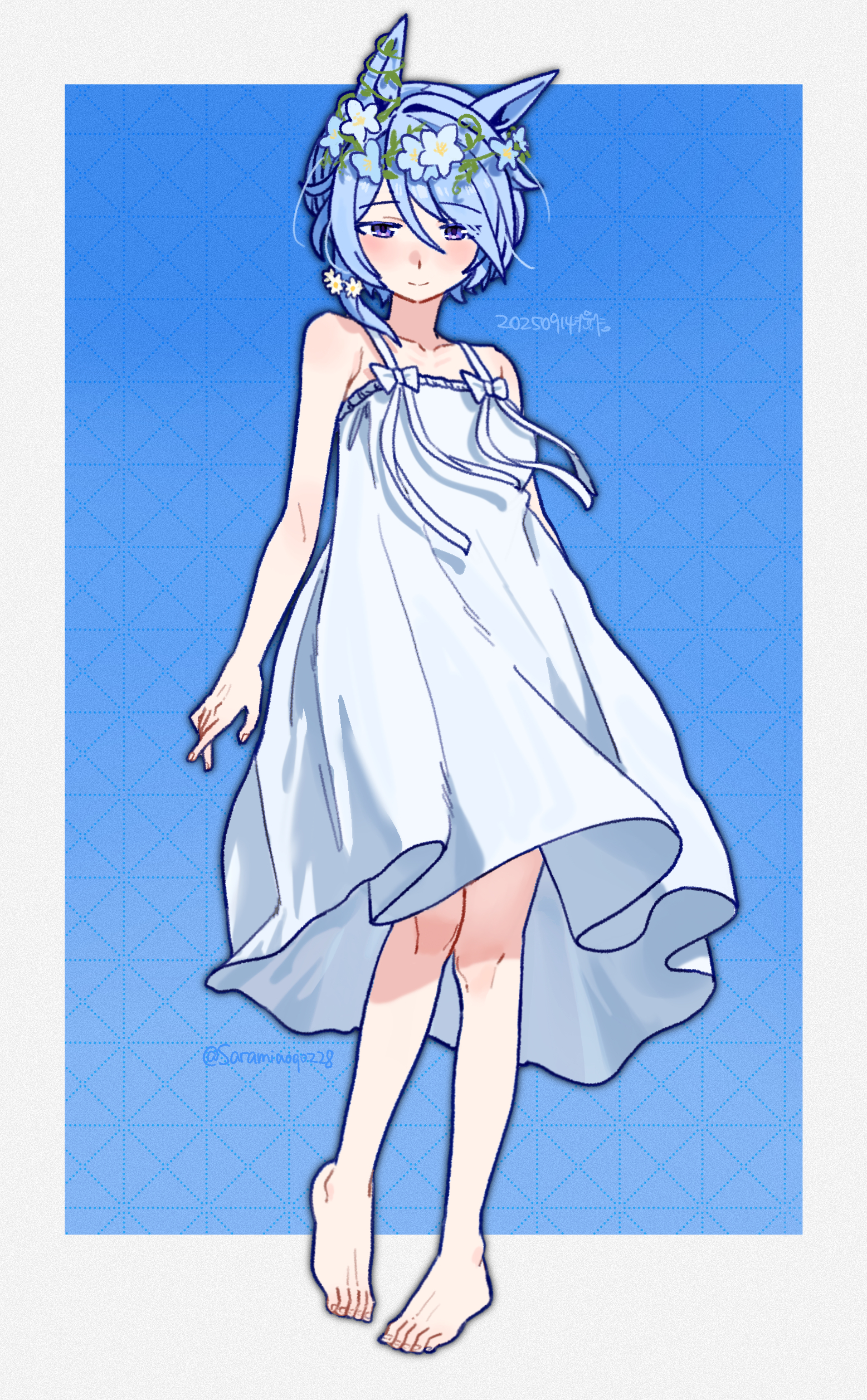 1girl absurdres animal_ears bare_shoulders blue_eyes blue_hair blush breasts closed_mouth collarbone commentary_request dress flower full_body hair_between_eyes hair_flower hair_ornament hair_vines highres horse_ears horse_girl k.s.miracle_(umamusume) looking_at_viewer saramiao-chan short_hair sleeveless sleeveless_dress small_breasts smile solo umamusume white_dress