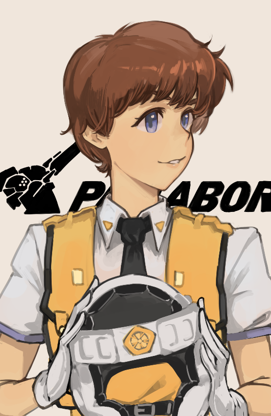 1girl black_necktie blue_eyes brown_hair collared_shirt commentary copyright_name gloves helmet holding holding_unworn_helmet izumi_noa kidou_keisatsu_patlabor necktie parted_lips police police_uniform policewoman shirt short_hair short_sleeves smile solo toastitos unworn_headwear unworn_helmet upper_body vest white_gloves white_shirt yellow_vest