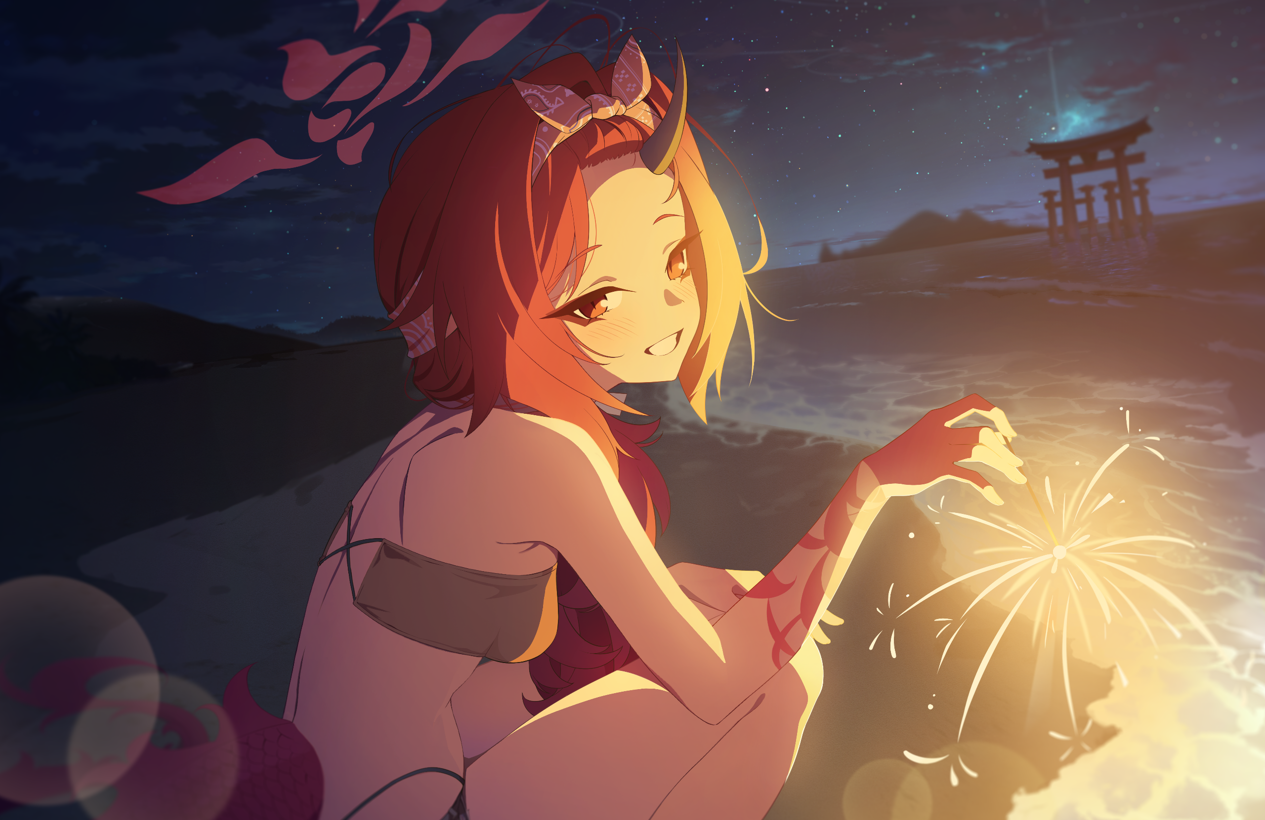 1girl bangs_pinned_back beach bikini blue_archive dragon_girl dragon_horn dragon_tail fireworks hairband highres horns long_hair looking_at_viewer night ocean official_alternate_costume official_art orange_hairband red_eyes red_hair red_tail renge_(blue_archive) renge_(swimsuit)_(blue_archive) single_horn solo squatting swimsuit tail torii