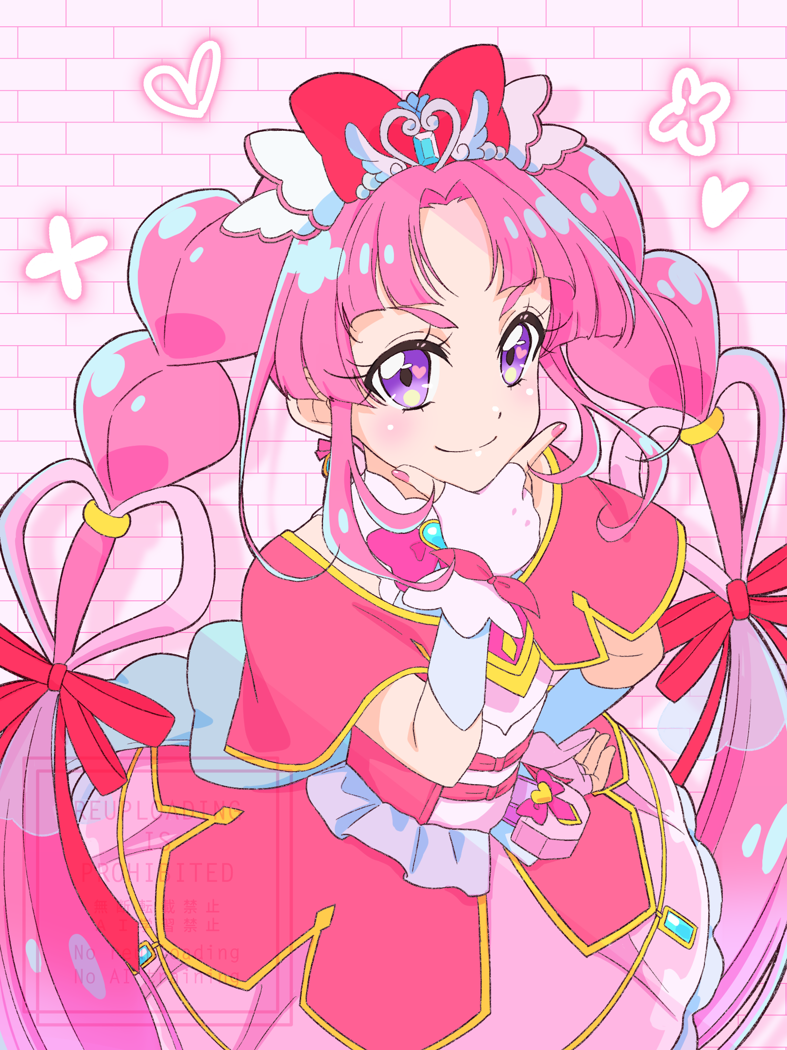 1girl bow bowtie braid brick_wall brooch capelet closed_mouth cowboy_shot cure_mystique dress earrings fingerless_gloves gloves hair_bow hair_ornament hair_ribbon hand_on_own_chin heart heart_brooch heart_hair_ornament highres jewelry kobayashi_mikuru long_hair looking_at_viewer magical_girl medium_dress meitantei_precure! pact_holder parted_bangs pink_hair precure purple_eyes red_bow red_bowtie red_capelet red_dress red_ribbon ribbon sleeveless sleeveless_dress smile solo standing twin_braids very_long_hair white_gloves yumes221