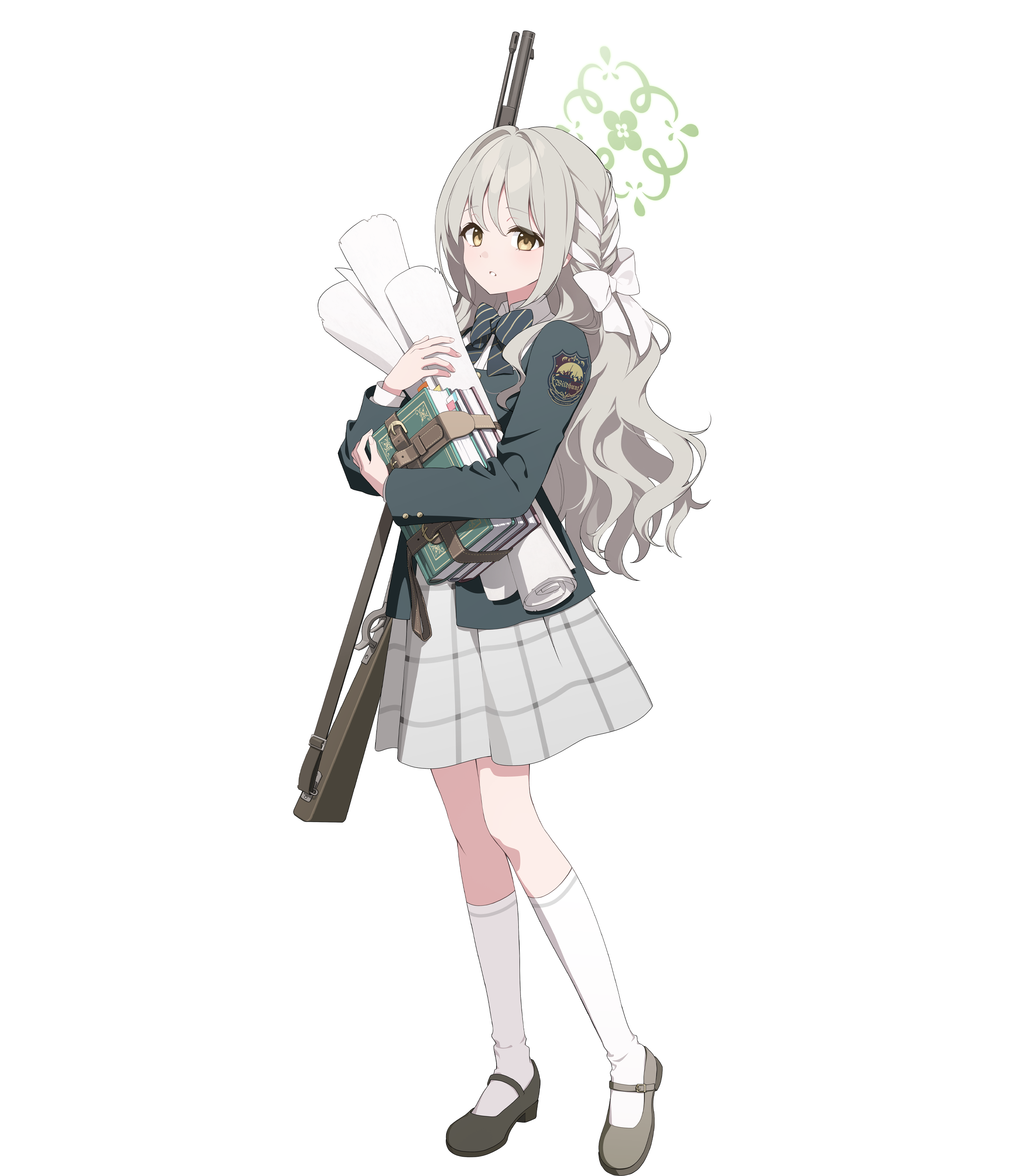 1girl absurdres blue_archive bolt-action_rifle book bow bowtie diagonal-striped_bow diagonal-striped_bowtie diagonal-striped_clothes full_body green_bow green_halo green_jacket grey_hair gun halo highres jacket kneehighs long_hair long_sleeves mary_janes miyo_(blue_archive) official_art plaid_clothes plaid_skirt rifle rolled-up_paper shirt shoes skirt socks solo striped_bow striped_bowtie striped_clothes transparent_background vetterli_m1870 weapon white_bow white_shirt white_socks yellow_eyes