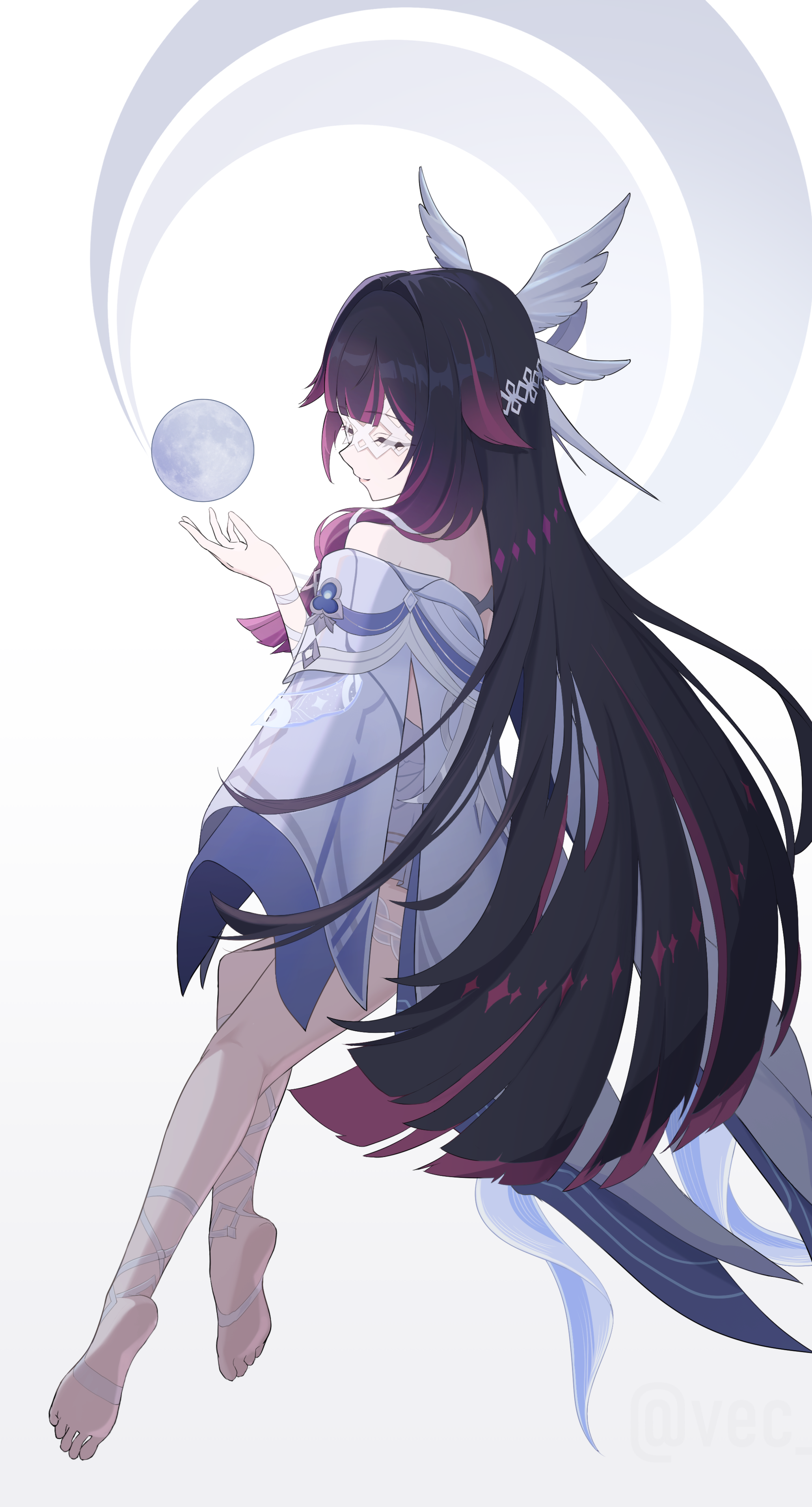 1girl absurdres barefoot black_hair closed_eyes columbina_(genshin_impact) commentary_request dress eye_mask full_body genshin_impact hair_over_shoulder head_wings highres long_hair mask moon multicolored_hair off-shoulder_dress off_shoulder pink_hair soles solo thigh_strap two-tone_hair vec_ka very_long_hair white_background white_dress white_wings wings