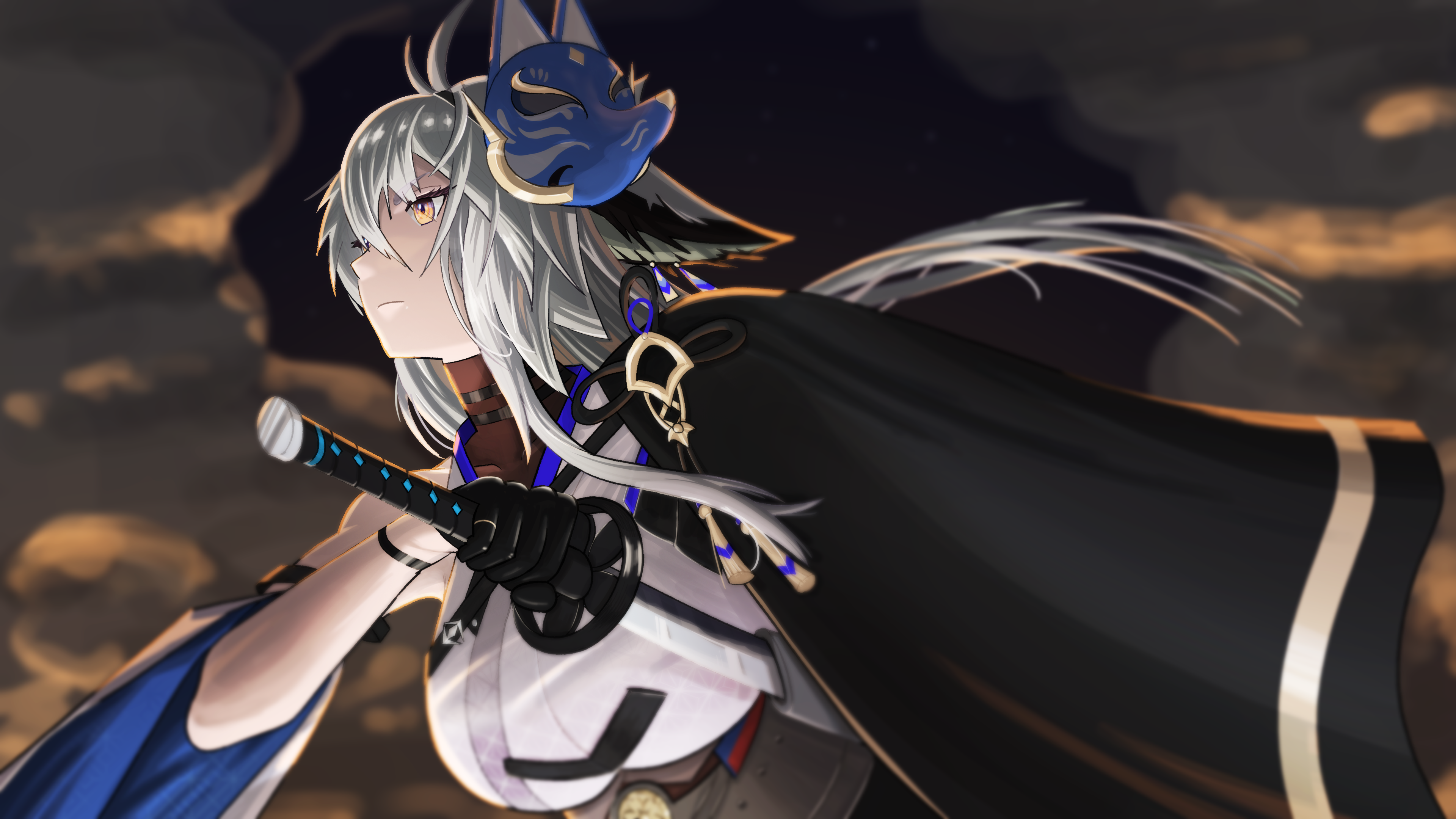 1girl absurdres animal_ears antenna_hair azur_lane black_capelet black_gloves breasts capelet cloud detached_sleeves fox_ears fox_girl fox_mask gloves grey_hair hairband highres katana large_breasts long_hair looking_ahead mask parttimetoast single_bare_shoulder solo star_(sky) sword tosa_(azur_lane) weapon yellow_eyes