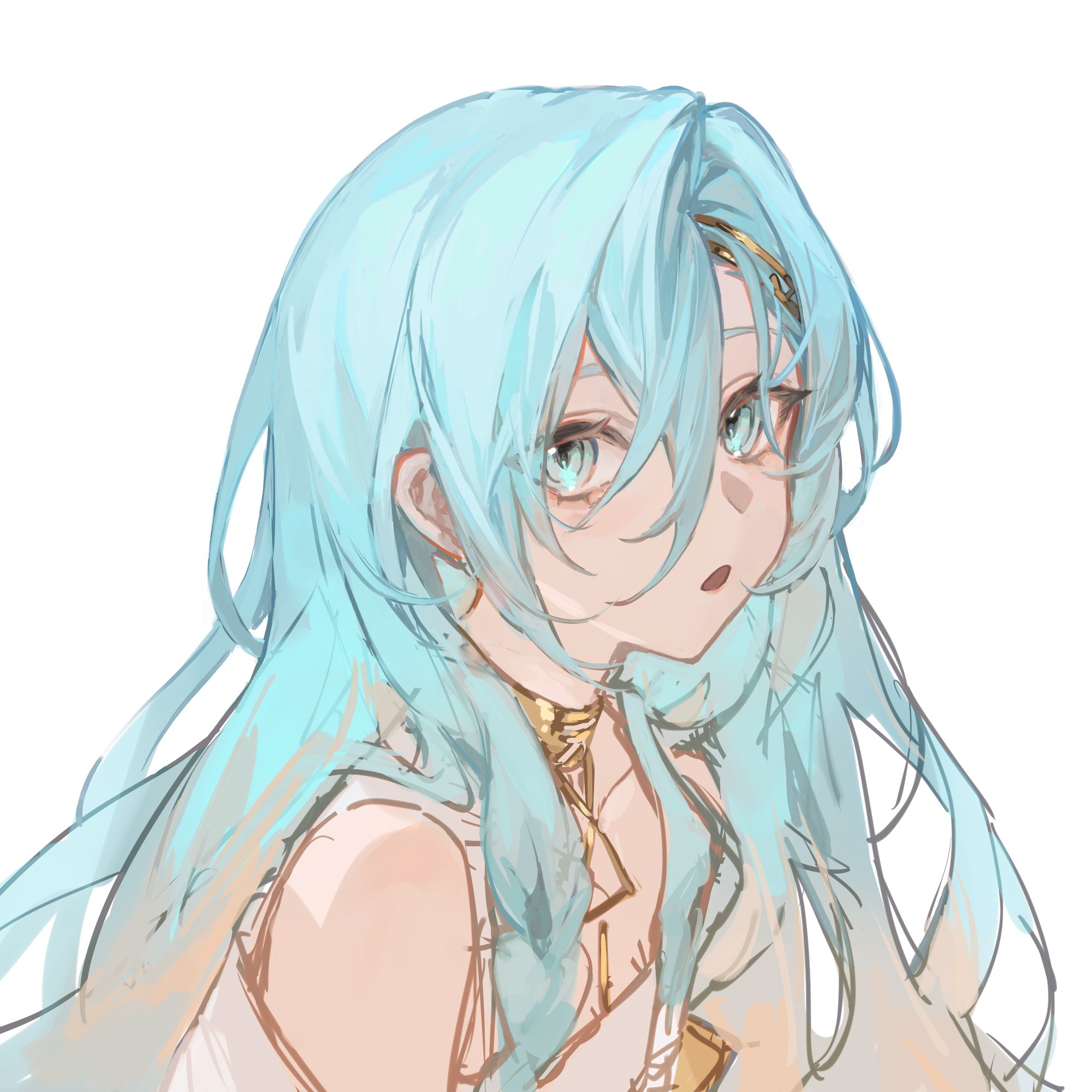1girl 37_(reverse:1999) :o blue_eyes blue_hair clothing_request gradient_hair hair_between_eyes highres long_hair looking_at_viewer multicolored_hair open_mouth portrait reverse:1999 sidelocks simple_background solo sparkling_eyes upper_body white_background yamiiv