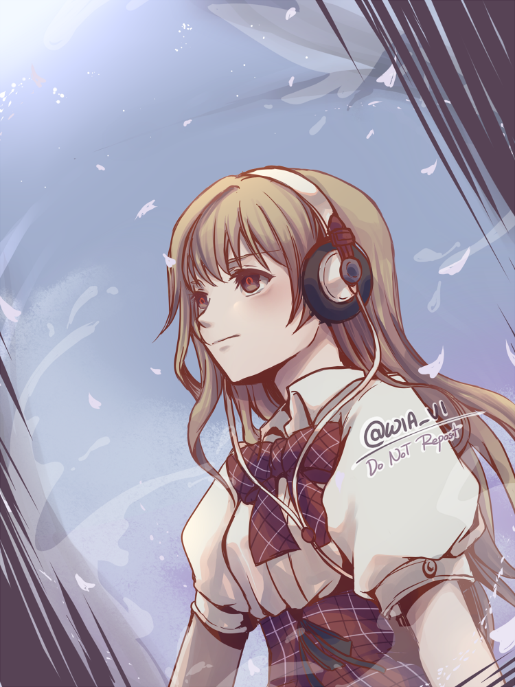 1girl artist_name blue_sky bright_pupils closed_mouth collared_shirt eyebrows_hidden_by_hair fate_(series) feathers grey_eyes grey_hair headphones long_hair matsunae_tsugumi outdoors plaid_clothes plaid_ribbon plaid_skirt puffy_short_sleeves puffy_sleeves red_eyes red_ribbon red_skirt ribbon shin_subarashiki_kono_sekai shirt short_sleeves skirt sky solo subarashiki_kono_sekai sunlight twitter_username upper_body vi_(vichan) white_shirt wia_vi