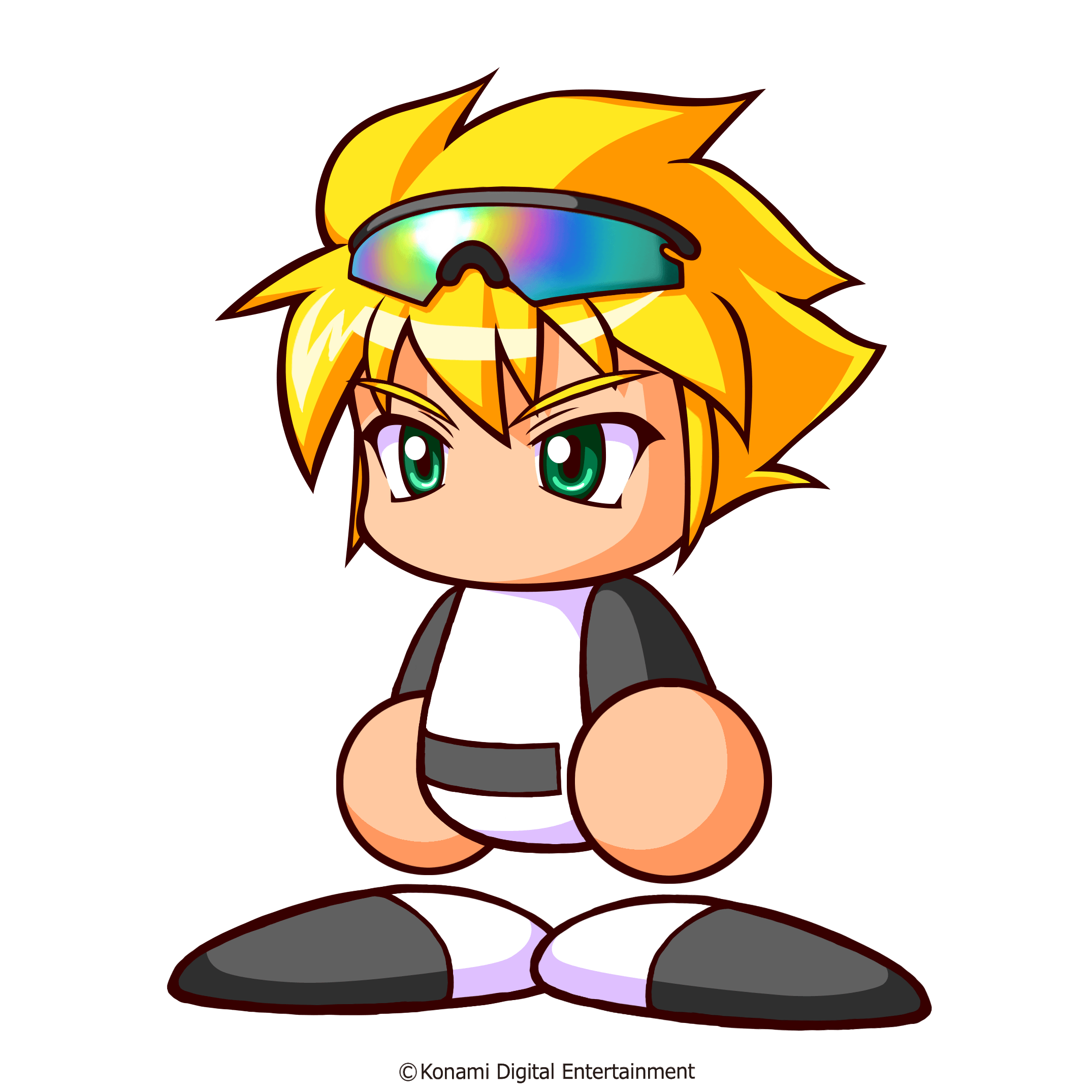 1boy artist_request baseball_uniform black_shirt black_shoes blonde_hair copyright_notice eyewear_on_head green_eyes highres jikkyou_powerful_pro_yakyuu jikkyou_powerful_pro_yakyuu_(style) multicolored_shirt multicolored_shoes no_mouth official_art rayman_limbs shirt shoes solo sportswear sunglasses tomozawa_ryo two-tone_shirt two-tone_shoes white_shirt white_shoes