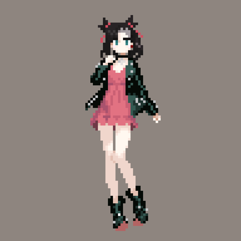 1girl black_boots black_choker black_jacket boots castlebear choker commentary_request dress full_body green_eyes grey_background hair_ribbon hand_up jacket looking_at_viewer marnie_(pokemon) nintendo no_mouth pink_dress pixel_art pokemon pokemon_sword_and_shield ribbon simple_background solo thighs twintails