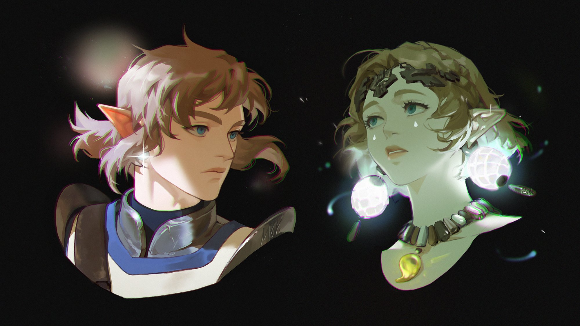 1boy 1girl black_background blonde_hair blue_eyes braid closed_mouth cropped_head crown_braid earrings green_eyes highres jewelry link m88km88k magatama magatama_necklace necklace nintendo parted_lips pendant_choker pointy_ears ponytail princess_zelda short_hair sidelocks the_legend_of_zelda the_legend_of_zelda:_tears_of_the_kingdom upper_body
