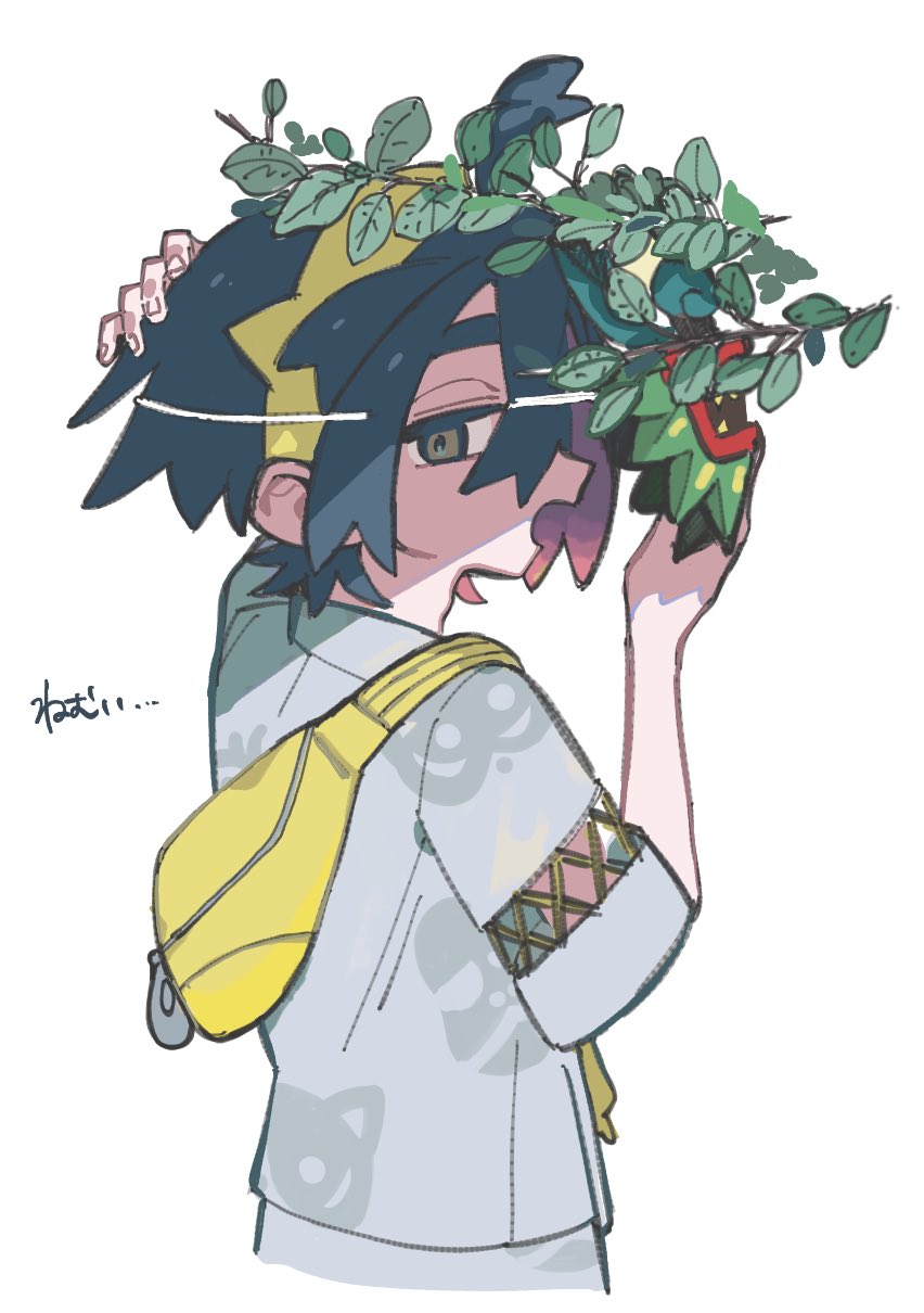 1boy bag black_hair cropped_legs festival_jinbei from_side hair_between_eyes hairband hand_on_own_head head_wreath hei_tai_(kyaputen1) highres holding holding_mask japanese_clothes kieran_(pokemon) leaf looking_at_viewer male_focus mask multicolored_hair nintendo open_mouth pokemon pokemon_scarlet_and_violet profile purple_hair short_sleeves simple_background solo translation_request white_background yellow_bag yellow_hairband