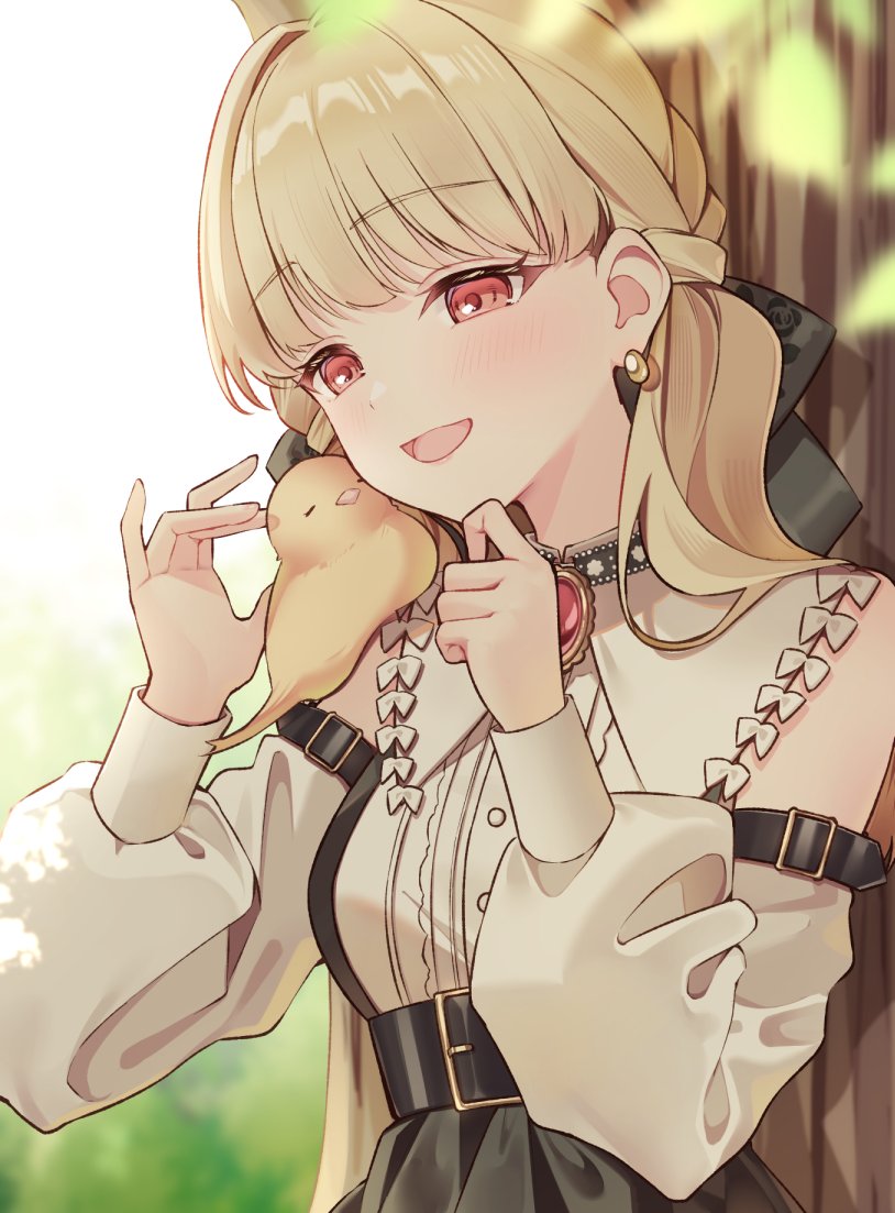 1girl baby_animal bird black_bow blonde_hair blush bow brooch chick commentary_request detached_sleeves earrings hair_bow itoi_toi jewelry kogara_toto kogara_toto_(gothic) open_mouth outdoors red_eyes shirt solo virtual_youtuber vspo! white_shirt