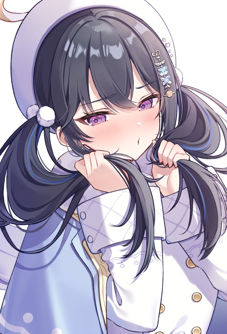 1girl black_hair blue_hair blush closed_mouth commentary_request grabbing_own_hair hair_ornament halo hat holding holding_own_hair ichinose_uruha ichinose_uruha_(7th_costume) itoi_toi long_sleeves multicolored_hair pom_pom_(clothes) pom_pom_hair_ornament purple_eyes solo streaked_hair two-tone_hair virtual_youtuber vspo! white_background white_hat