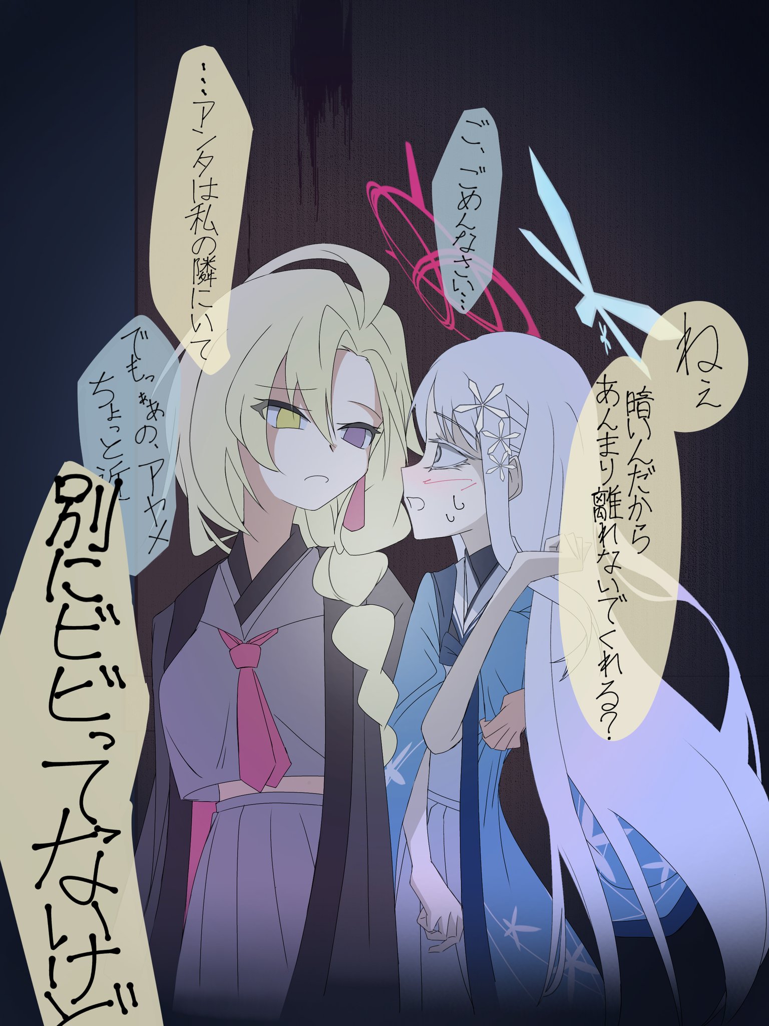 2girls ahoge ayame_(blue_archive) blue_archive blue_haori braid colored_eyelashes commentary_request cowboy_shot grey_sailor_collar grey_skirt hair_ornament halo haori heterochromia highres japanese_clothes multiple_girls nagusa_(blue_archive) neckerchief pleated_skirt purple_eyes red_neckerchief sailor_collar sailor_shirt school_uniform serafuku shirt single_braid skirt snowflake_hair_ornament snowflake_halo spoilers translation_request usurume white_eyelashes white_halo white_sailor_collar white_serafuku white_shirt white_skirt yellow_eyes