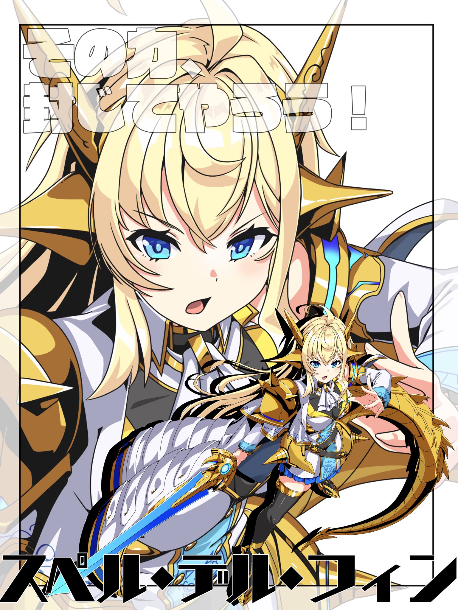 1girl ahoge black_thighhighs blonde_hair blue_eyes blue_skirt breasts commentary_request dragon_girl dragon_horns dragon_tail dress duel_masters duel_masters_play's from_above gold_shoes gold_trim hair_ornament highres holding holding_sword holding_weapon horns large_breasts long_hair multicolored_dress open_mouth outstretched_arm see-through_cleavage see-through_clothes shoes shoulder_pads skirt solo spell_del_fin_(duel_masters) sword tail thighhighs translation_request very_long_hair weapon white_background white_dress zeke_(analogmon) zoom_layer