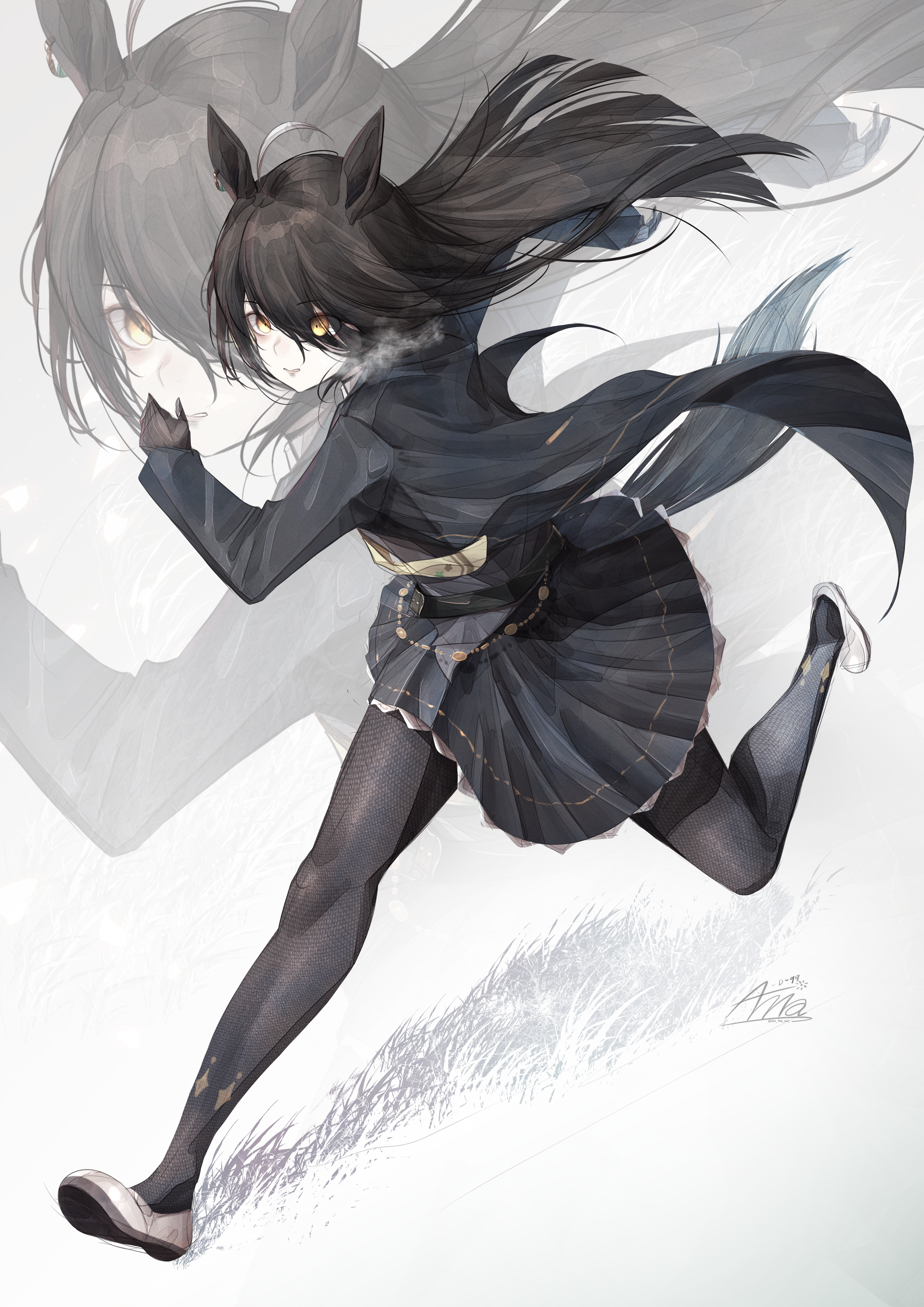 1girl absurdres ahoge animal_ears annasui_factory black_coat black_gloves black_hair black_pantyhose black_skirt coat collared_shirt ear_tag earrings gloves hair_between_eyes highres horse_ears horse_girl horse_tail jewelry long_bangs long_hair long_hair_between_eyes long_sleeves manhattan_cafe_(creeping_shadow)_(umamusume) manhattan_cafe_(umamusume) multicolored_hair necktie pantyhose parted_lips pleated_skirt running shirt shoes simple_background single_earring skirt tail umamusume white_hair yellow_eyes yellow_necktie zoom_layer
