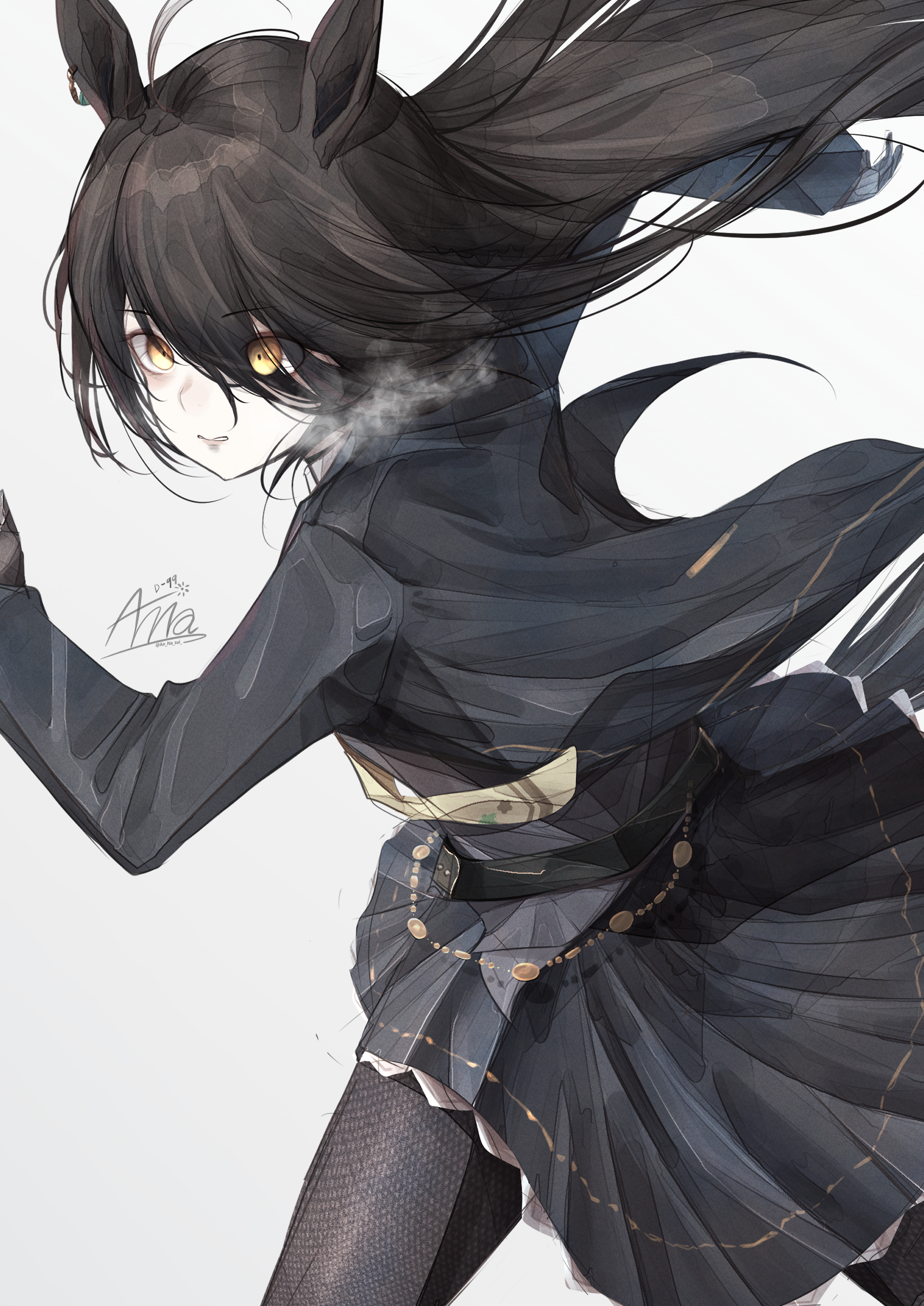 1girl absurdres ahoge animal_ears annasui_factory black_coat black_gloves black_hair black_pantyhose black_skirt coat collared_shirt ear_tag earrings gloves hair_between_eyes highres horse_ears horse_girl horse_tail jewelry long_bangs long_hair long_hair_between_eyes long_sleeves manhattan_cafe_(creeping_shadow)_(umamusume) manhattan_cafe_(umamusume) multicolored_hair necktie pantyhose parted_lips pleated_skirt running shirt simple_background single_earring skirt solo tail umamusume white_background white_hair yellow_eyes yellow_necktie