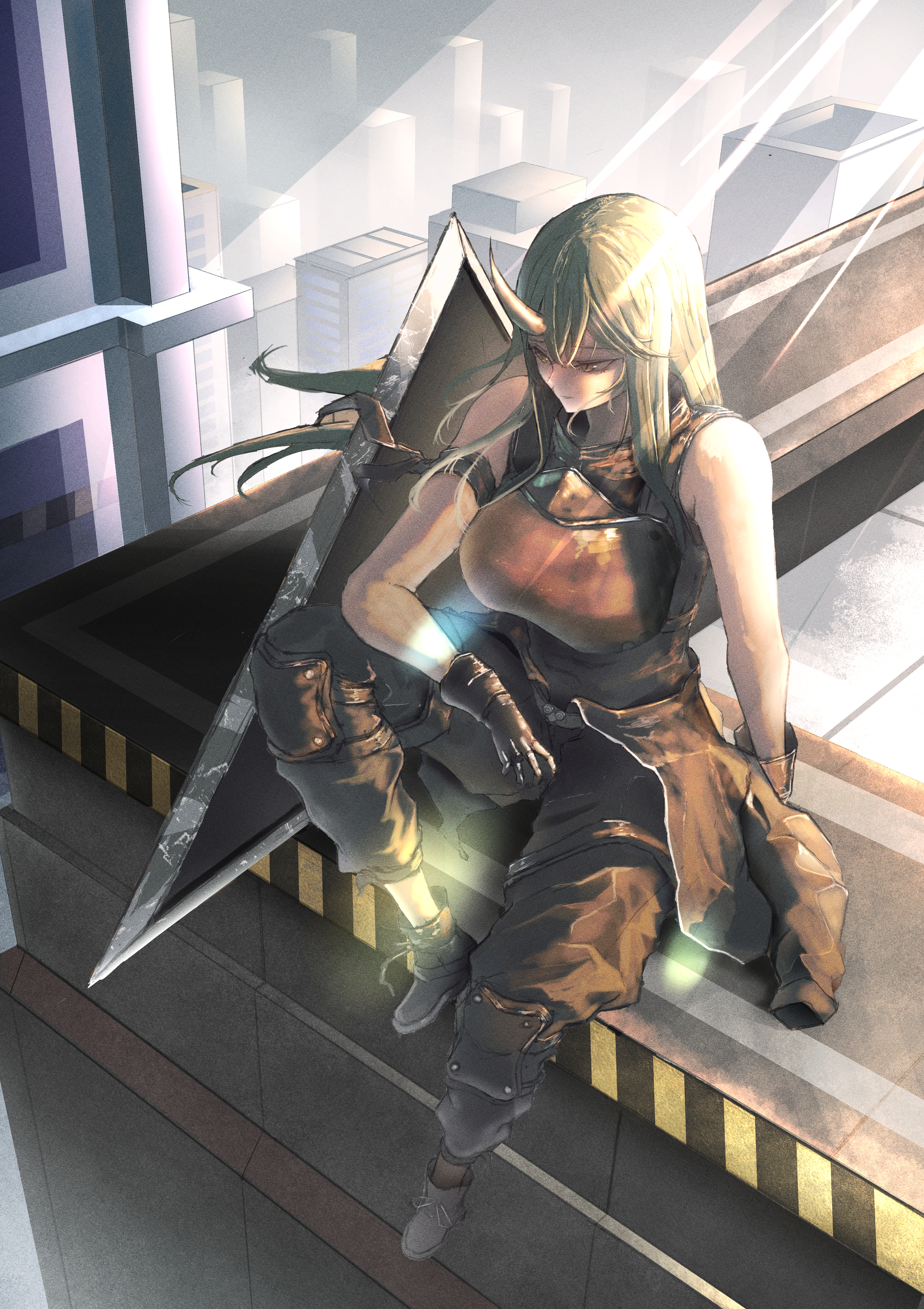 1girl absurdres ankle_boots arknights armor bare_shoulders black_boots black_gloves black_pants black_shirt boots commentary full_body gloves green_eyes green_hair hair_between_eyes highres horns hoshiguma_(arknights) knee_pads lens_flare light_rays long_hair looking_down momoken2004_(inb6k7) pants revision shirt single_horn sitting skin-covered_horns sleeveless sleeveless_shirt solo