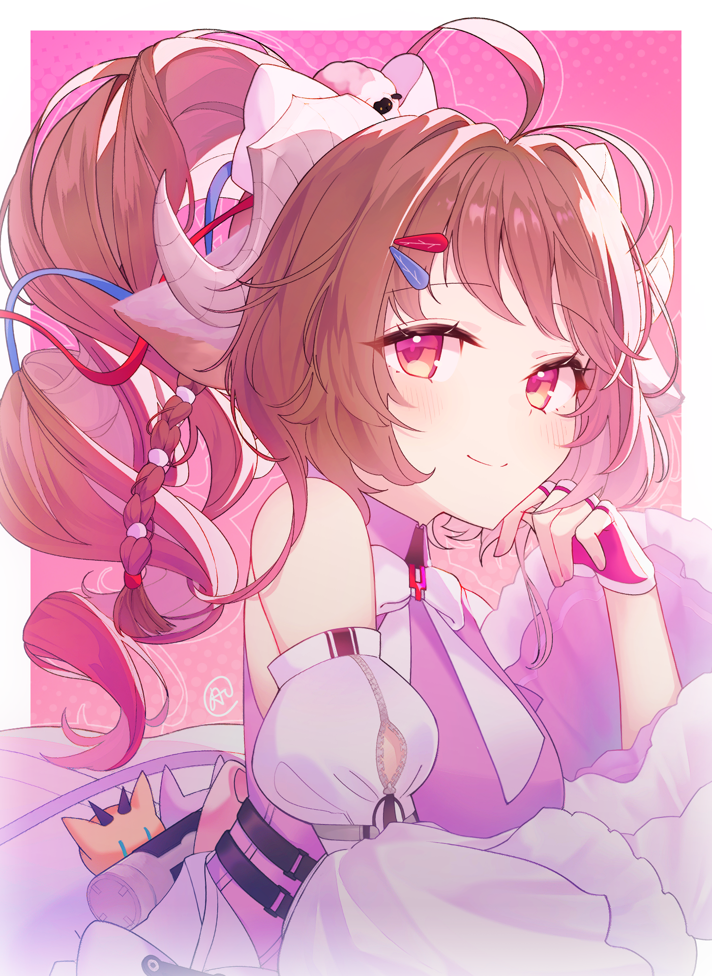 1girl ahoge aprahnicus ardelia_(arknights) arknights arknights:_endfield bare_shoulders brown_hair detached_sleeves dress eyjafjalla_(arknights) fingerless_gloves gloves highres horns long_hair looking_at_viewer multicolored_gloves pink_eyes sheep_girl sheep_horns side_ponytail sleeveless sleeveless_dress solo two-tone_gloves upper_body