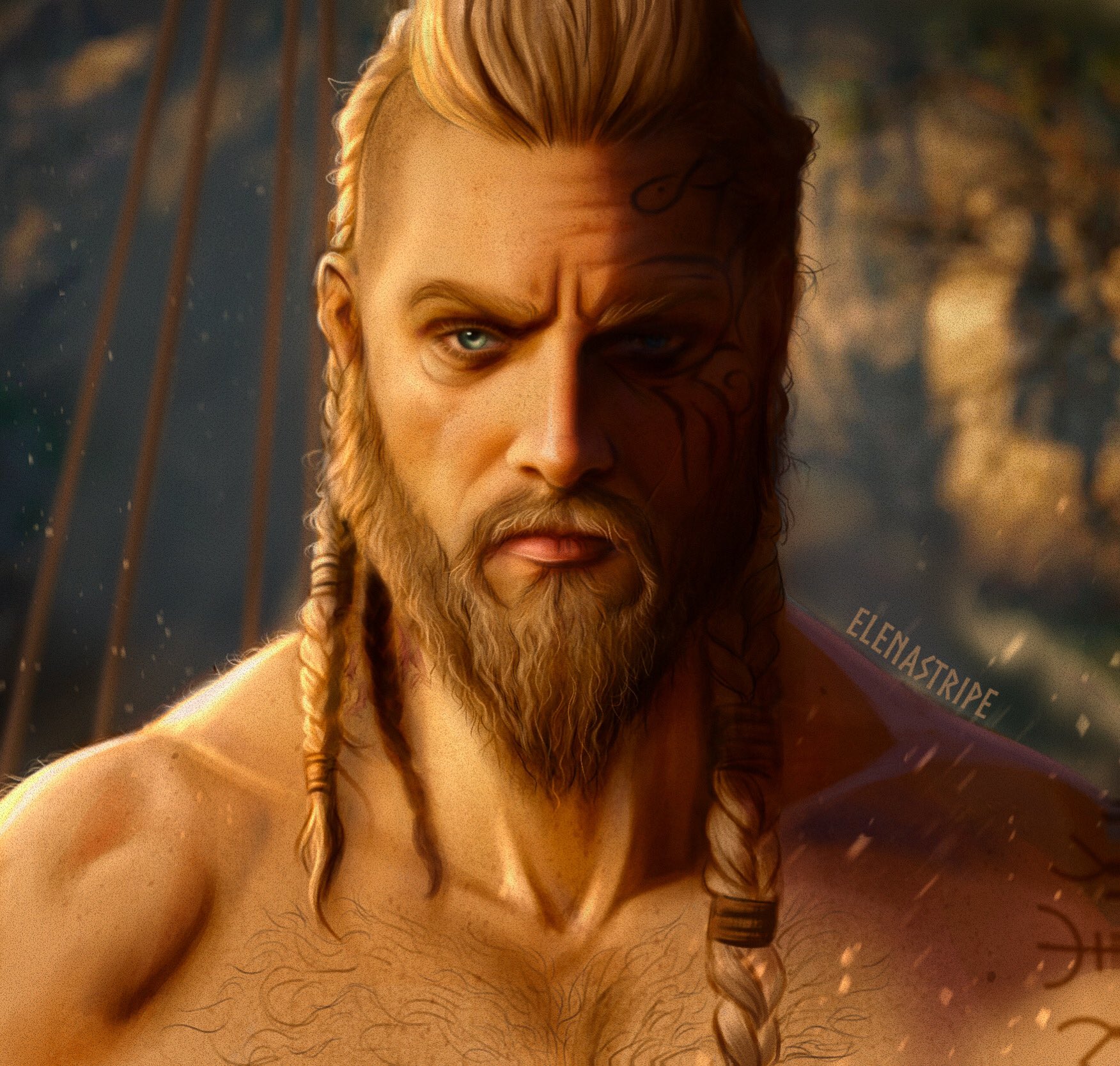 1boy artist_name assassin's_creed:_valhalla assassin's_creed_(series) beard blonde_hair blue_eyes eivor_varinsson elena_stripe embers facial_hair highres looking_at_viewer portrait realistic solo